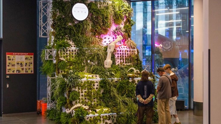 Кроме того, на площадке размещена инсталляция "Флора" – результат работы междисциплинарной команды и исследований Robohall и МГТУ им. Баумана. Это "ферма будущего", где растения, свет и машины взаимодействуют, создавая динамичную экосистему.