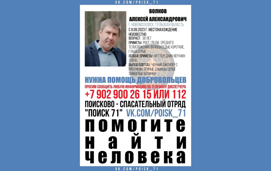 В Новомосковске Тульской области ищут пропавшего 38-летнего Алексея Александровича Волкова. Его местонахождение неизвестно с 9 сентября, сообщает региональный поисково-спасательный отряд «Поиск 71».