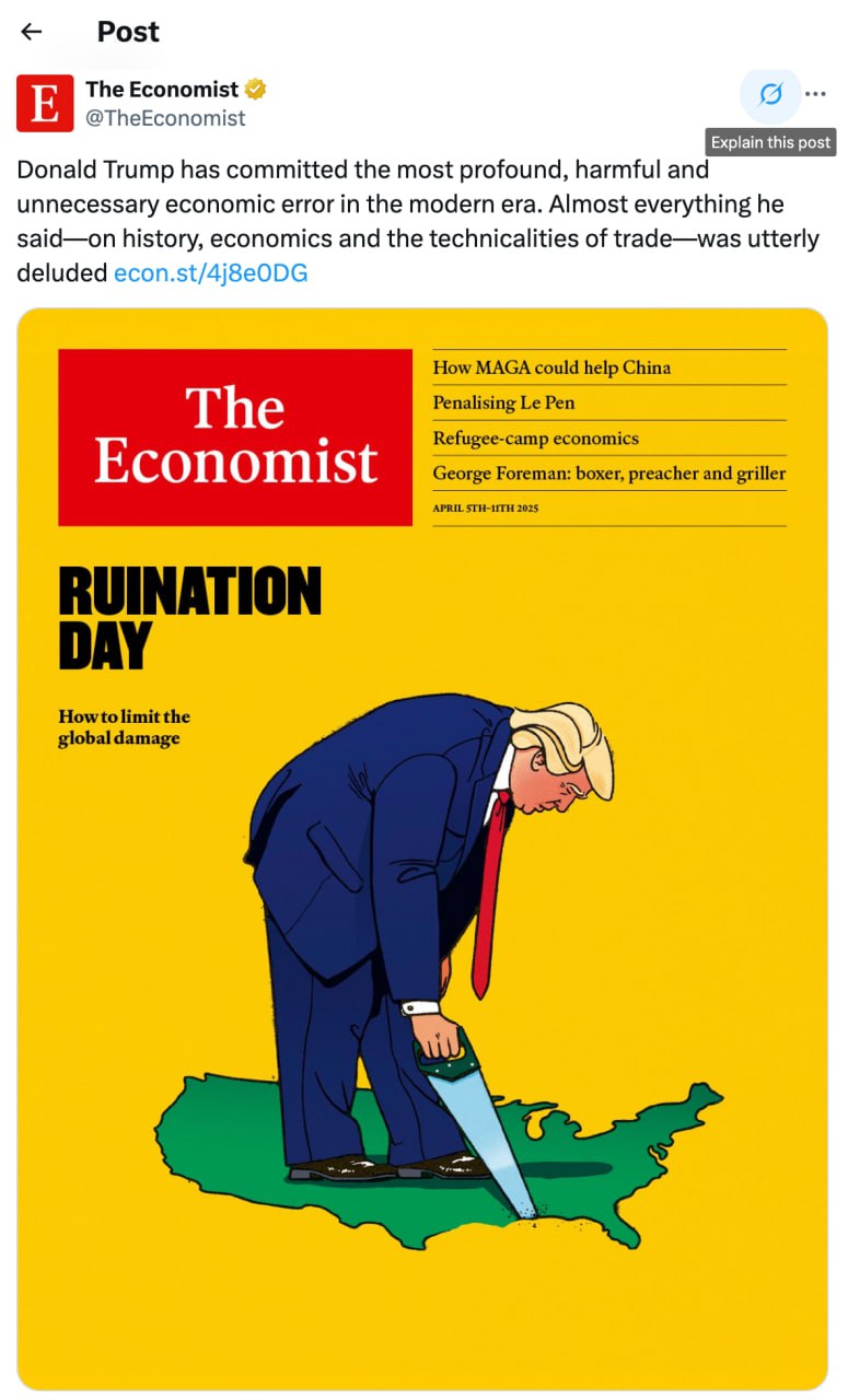 «Дональд Трамп совершил самую глубокую, разрушительную и ненужную экономическую ошибку в современной истории. Почти всё, что он сказал — об истории, экономике и деталях торговли, — было абсолютным заблуждением», — формулирует происходящее The Economist.
