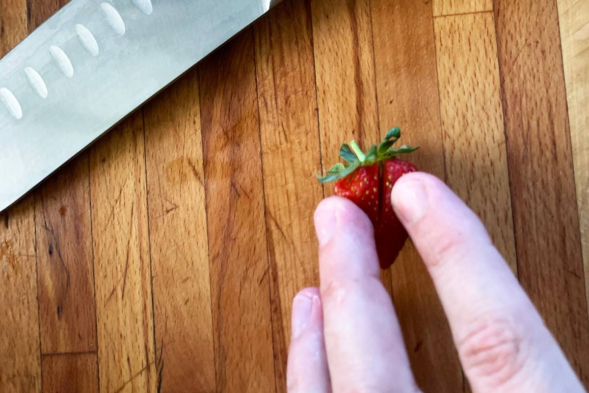 Шаг 6. Возьмите оставшиеся ягоды и надрежьте их от основания до середины. Украсьте клубникой край бокала и разлейте коктейль.