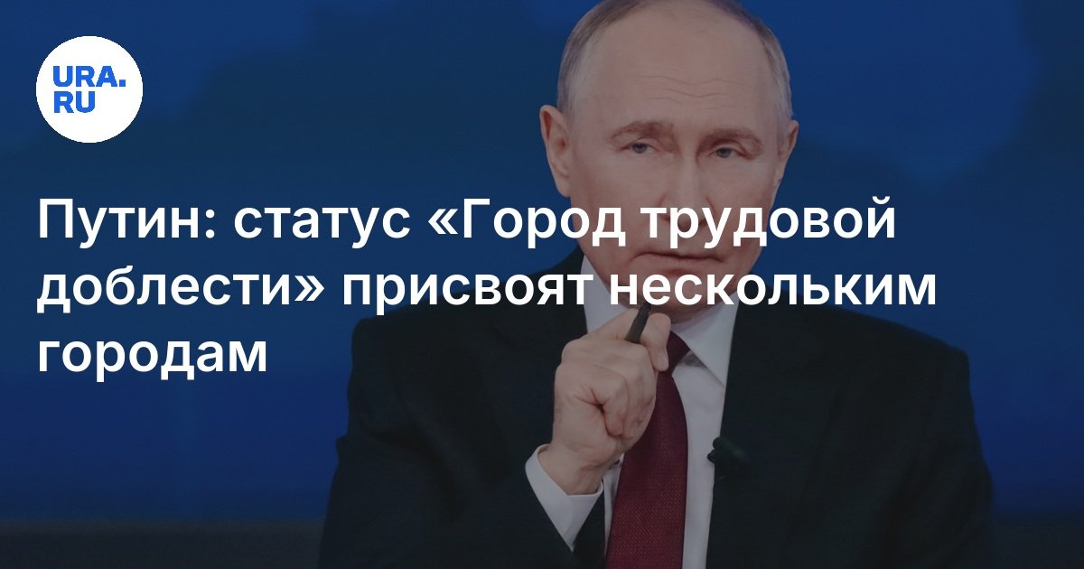 «Сегодня рассмотрим еще несколько заявок на получение этого высокого статуса (звание „Город трудовой доблести“ — прим. URA.RU)», — заявил президент России. Удостоены звания будут Курган (Курганская область), Верхняя Пышма (Свердловская область), Ишимбай (Республика Башкортостан), Ковров (Владимирская область), Миасс (Челябинская область), Зеленодольск (Республика Татарстан), Ленинск-Кузнецкий (Кемеровская область) и Салехард (Ямало-Ненецкий автономный округ).