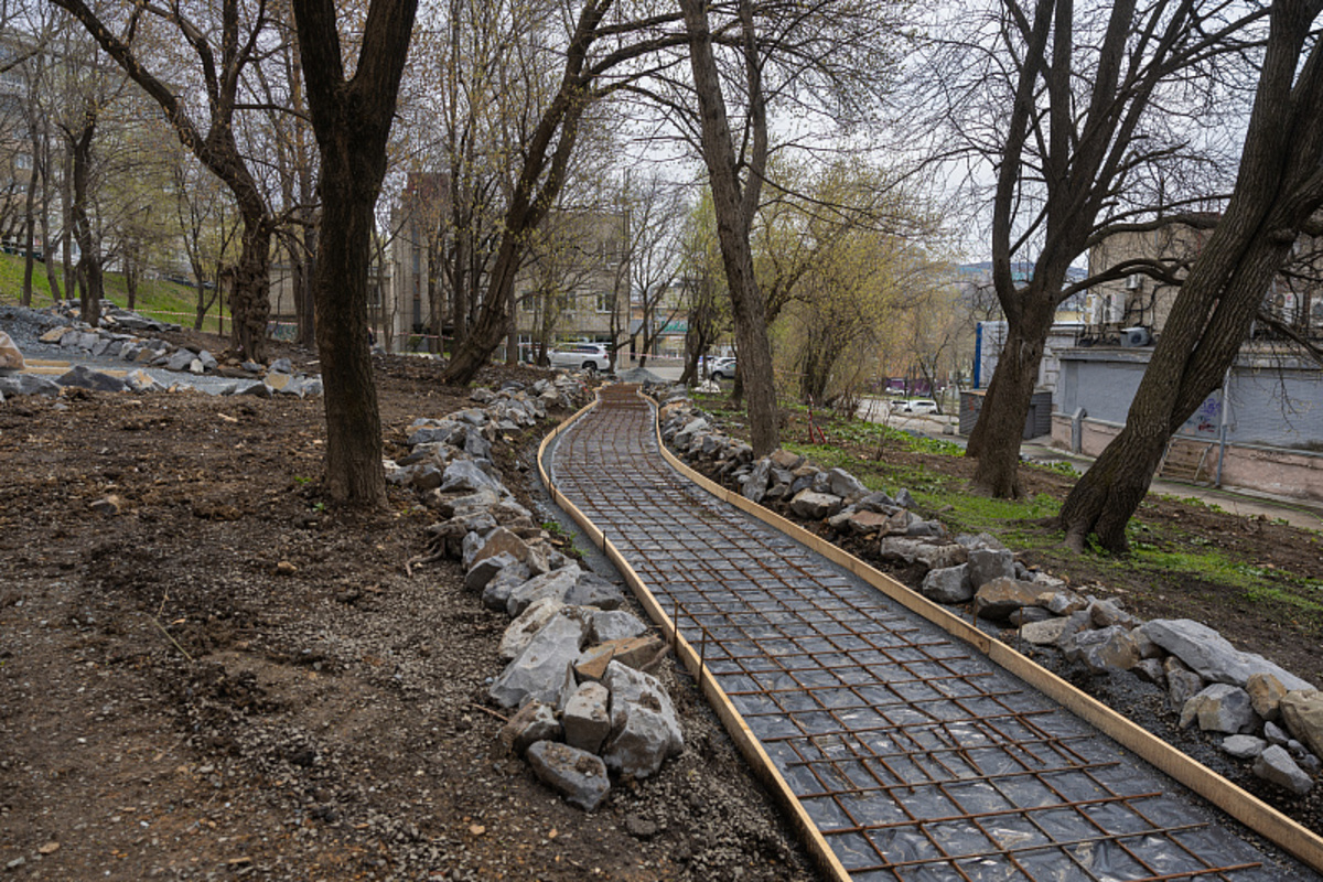 Как сообщает администрация Владивостока, в сквере Кутузова работы идут с опережением графика. Появилась новая лестница, идёт обустройство дорожек, также уже всё готово для установки детской площадки.