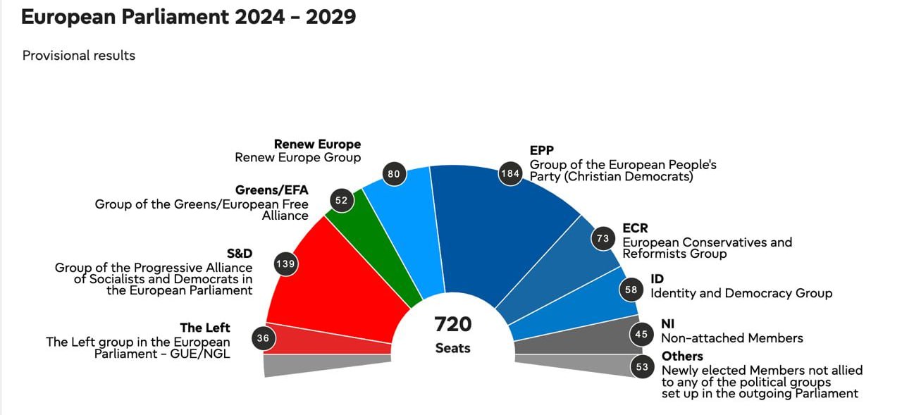 При этом значительные успехи крайне правых партий не смогли подорвать центристское большинство в Европарламенте — «Европейская народная партия», членом которой является глава Еврокомиссии Урсула фон дер Ляйен, получила 184 из 720 мест (25,56%). Она пообещала, что большинство в Европарламенте будет «проевропейским и проукраинским».