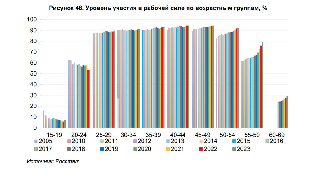 • Несмотря на то, что уровень участия в рабочей силе в 2023 достиг своего максимума в большинстве возрастных когорт, особо значительные изменения произошли в возрастных группах, затронутых пенсионной реформой (сильный рост участия в рабочей силы людей старше 55 лет), – это смогло лишь компенсировать сокращение численности трудоспособного населения.