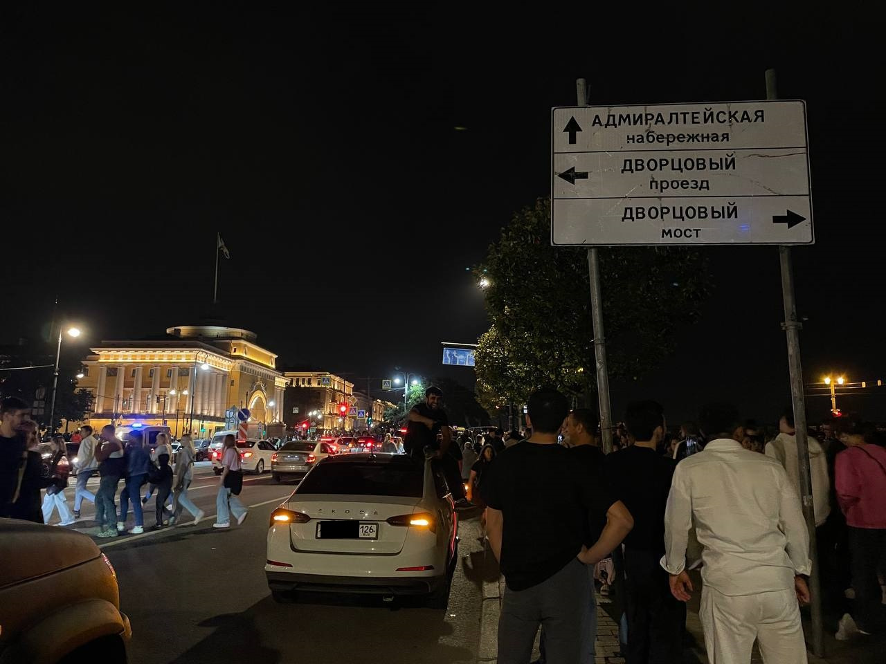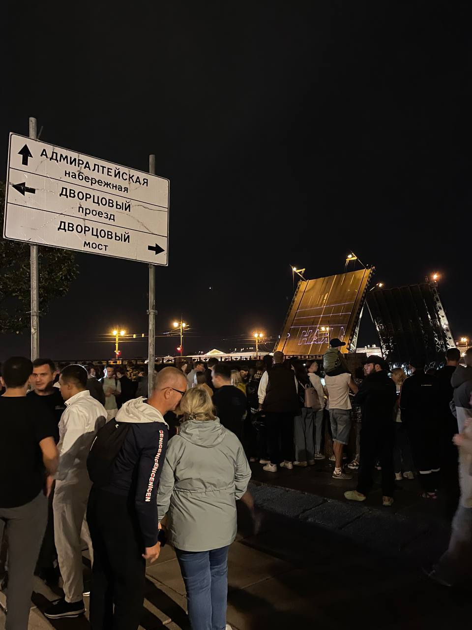 Ближе к часу ночи весь центр города стекается к набережной. У Зимнего дворца девушка под гитару поет «Отпускаю» МакSим, а десяток ее слушателей — перебегает дорогу на красный к Неве. Место в первых рядах на импровизированной смотровой площадке уже не найти: туристы и жители склеились в плотные три-четыре линии. Толпа в пару тысяч человек растеклась по всей набережной — от Эрмитажного театра и до Адмиралтейства.