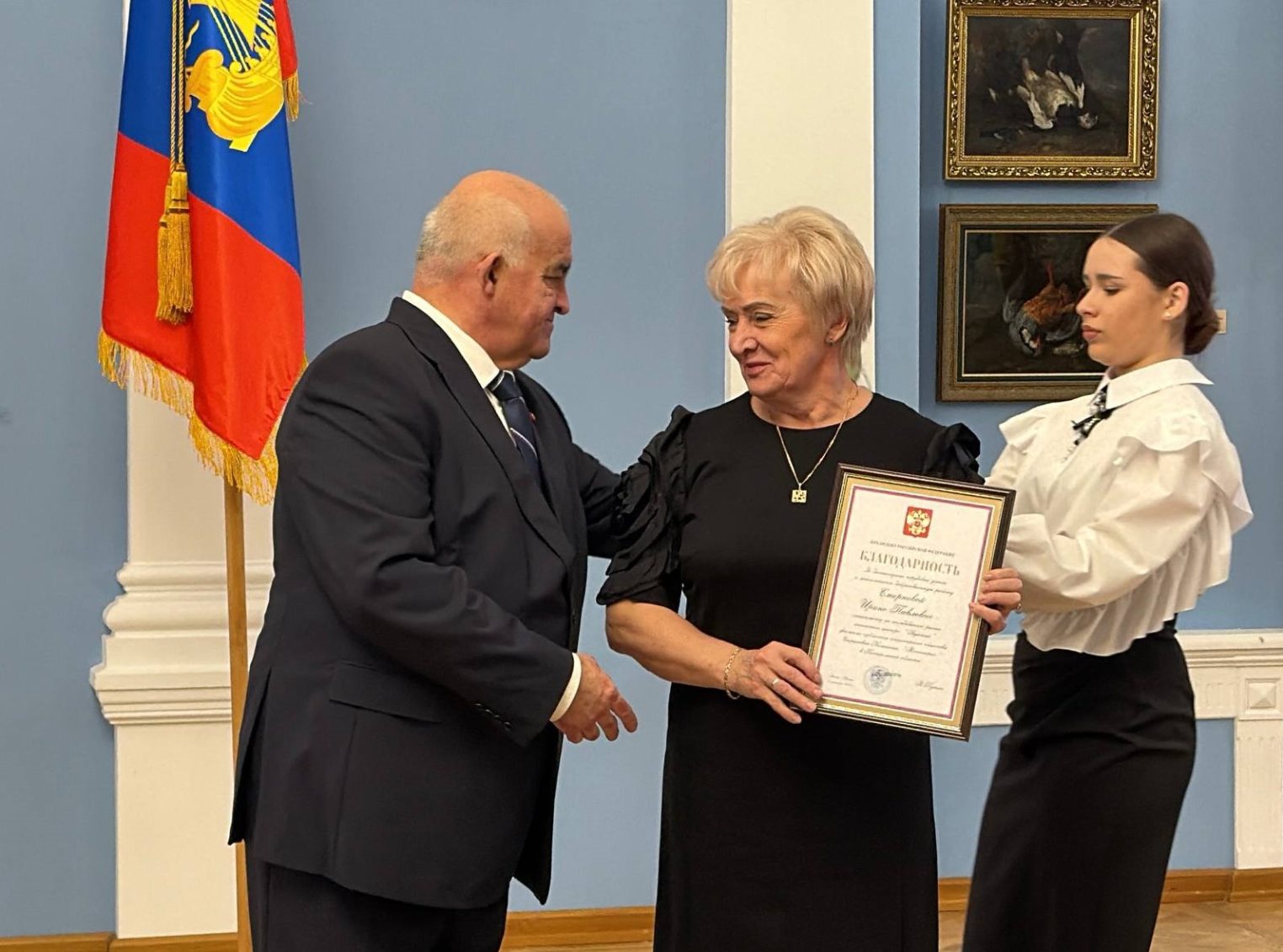 В торжественной обстановке губернатор Костромской области Сергей Ситников вручил благодарность президента РФ специалисту по исследованию рынка агентского центра «Буйский» Ирине Смирновой — за достигнутые трудовые успехи и многолетнюю добросовестную работу.