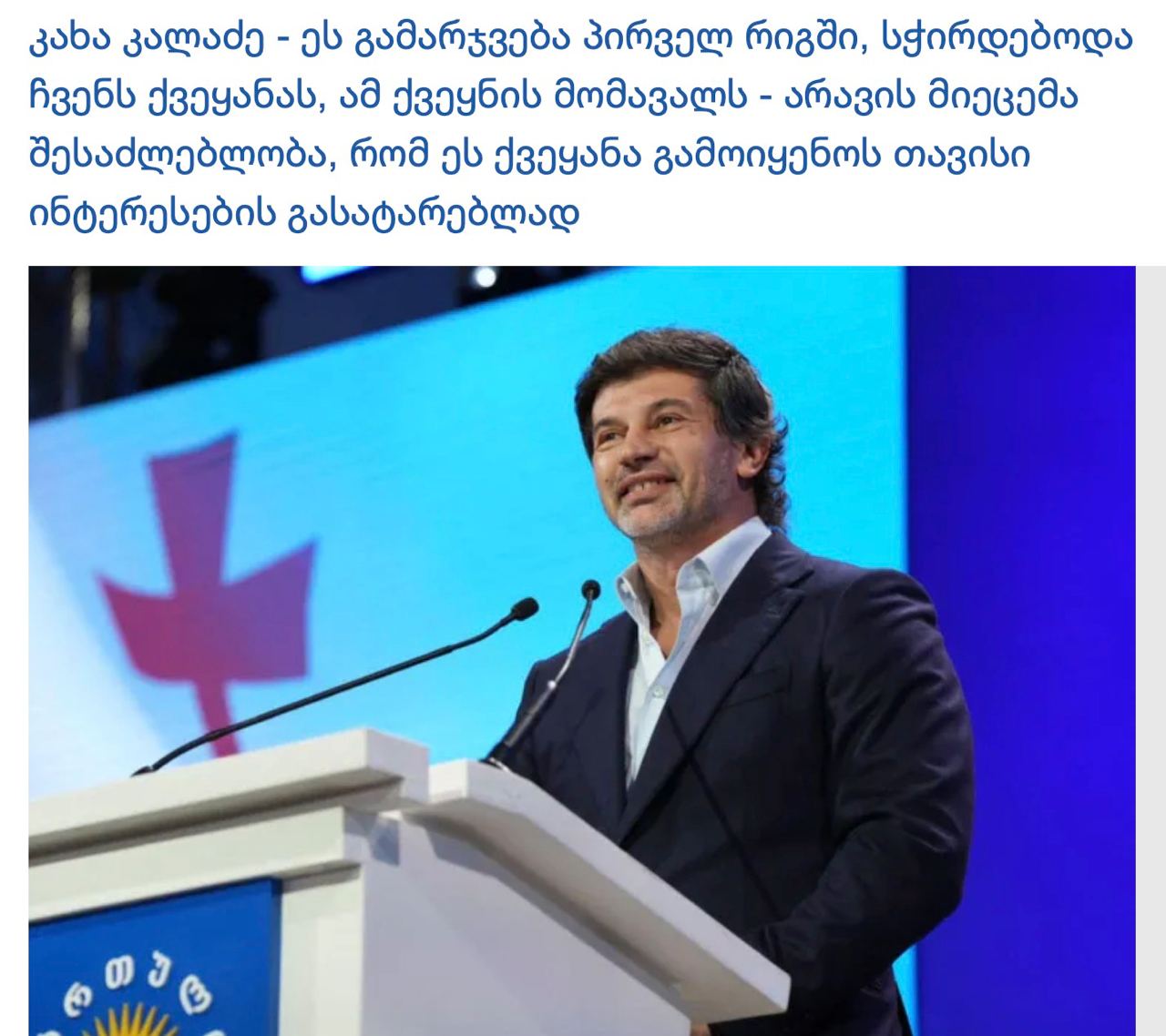 Генсек «Грузинской мечты» заявил о победе партии на парламентских выборах после оглашения предварительных данных ЦИК «Наша команда сделает всё для зашиты национальных интересов страны… <...> Поздравляю вас и всю Грузию с этой важной победой», – сказал Каха Каладзе. Подписывайтесь на «Абзац»