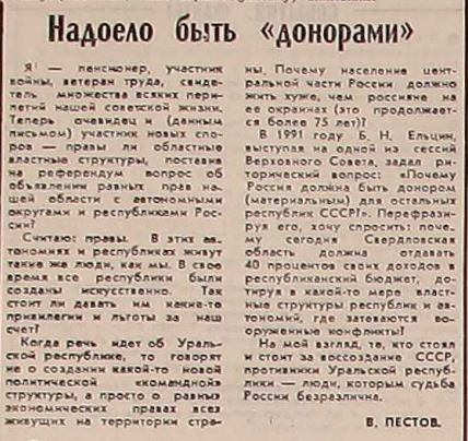 Узнать, что сами горожане думали о смене места жительства — с области на республику, можно из писем читателей в «Вечерку». Пенсионер, участник войны В. Пестов поддержал «провозглашение равных прав с автономными округами и республиками России»: