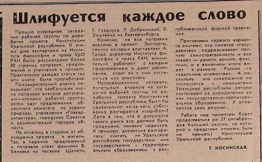 Но, несмотря на разные мнения, процесс был запущен. В сентябре появился проект Конституции Уральской республики, разработанный учеными из Института философии и права УрО РАН под руководством Анатолия Гайды. Затем 94-страничный документ вынесли на обсуждение сессии облсовета.