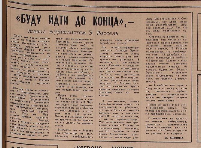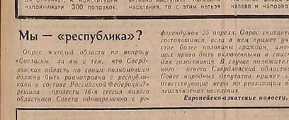 В начале месяца в «Вечернем Екатеринбурге» появилась заметка о том, что областной Совет решил одновременно с Всероссийским референдумом провести опрос жителей с такой формулировкой: «Согласны ли вы с тем, что Свердловская область по своим полномочиям должна быть равноправна с республиками в составе Российской Федерации?» Там же отмечалось, что в случае положительного ответа депутаты примут «меры по реализации волеизъявления населения».