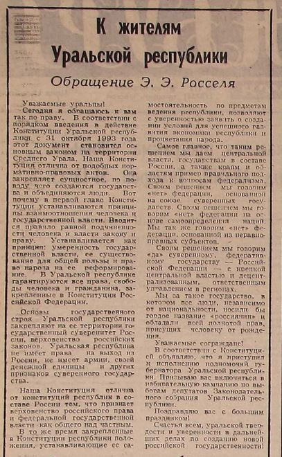 В номере за 5 ноября появилось обращение Эдуарда Росселя «К жителям Уральской республики», в котором он объявил, что приступил к исполнению полномочий губернатора Уральской республики. «Счастья всем, уральской твердости и уверенности в дальнейших делах по созданию новой российской государственности», — заключил он.