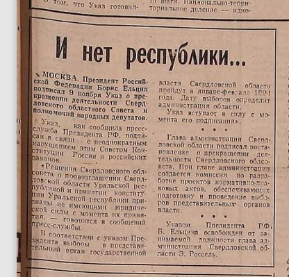 Но выборов губернатора Уральской республики так и не случилось: 9 ноября Борис Ельцин подписал указ о прекращении деятельности Свердловского областного совета и полномочий народных депутатов. Пресс-служба президента пояснила, что указ был издан «в связи с неоднократным нарушением этим советом Конституции России и российских законов».