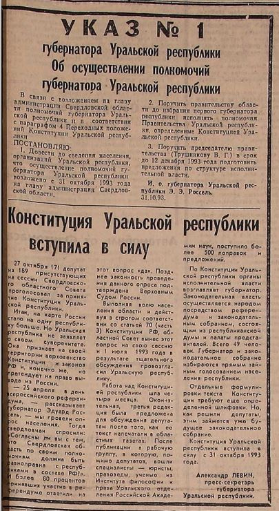 27 октября сессия облсовета приняла Конституцию Уральской республики. Эдуард Россель стал и. о. губернатора.