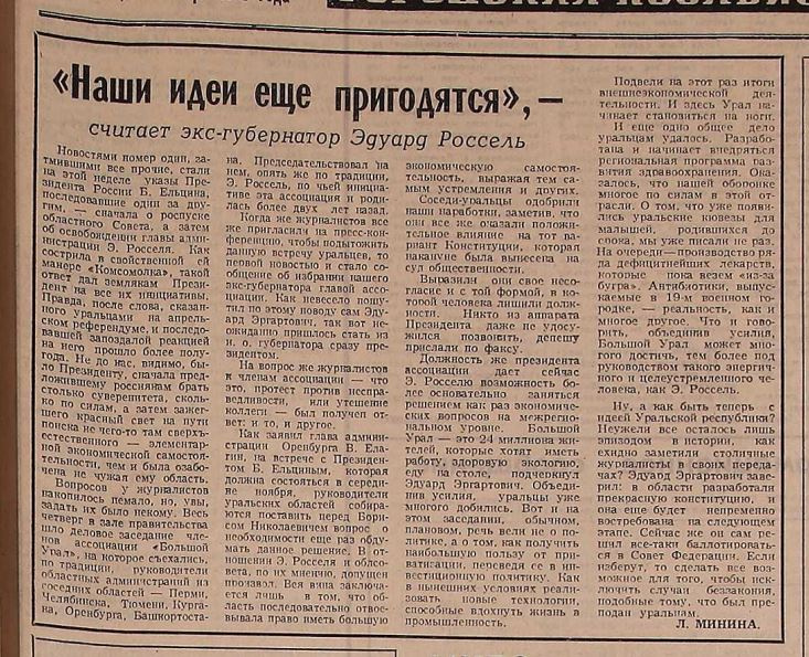 «Предупреждая вопросы, Анатолий Викторович [Гребенкин, председатель совета] подчеркнул, что создание Уральской республики отнюдь не ведет к развалу России, а, напротив, укрепит ее целостность, поскольку гарант этого — симметрическое построение государства», — говорилось в репортаже «Вечерки» с сессии облсовета.
