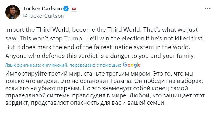 Признание Трампа виновным знаменует «конец самой справедливой системы правосудия в мире», заявил Такер Карлсон.
