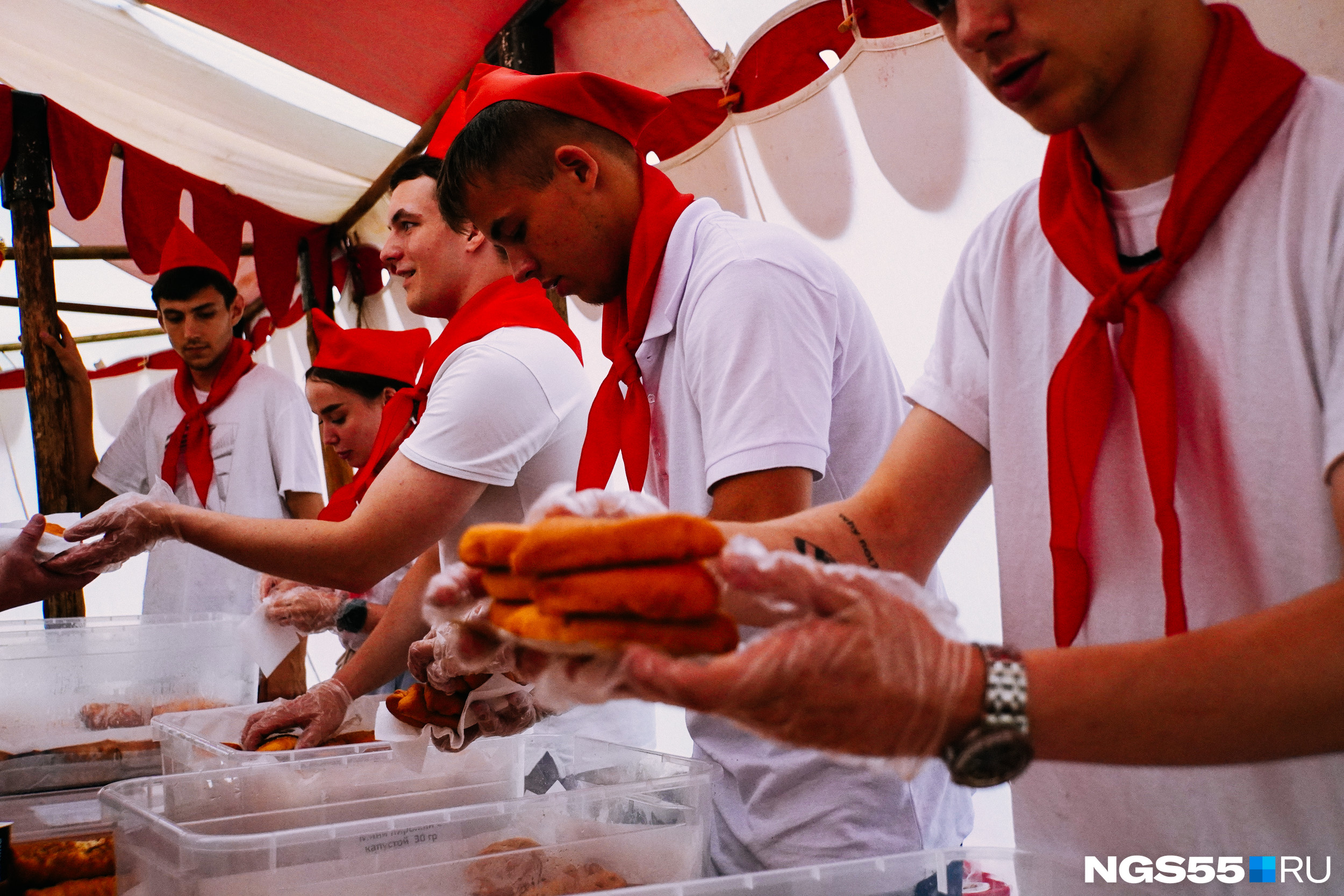 Юноши в пионерских галстуках раздавали пирожки и сосиски в тесте