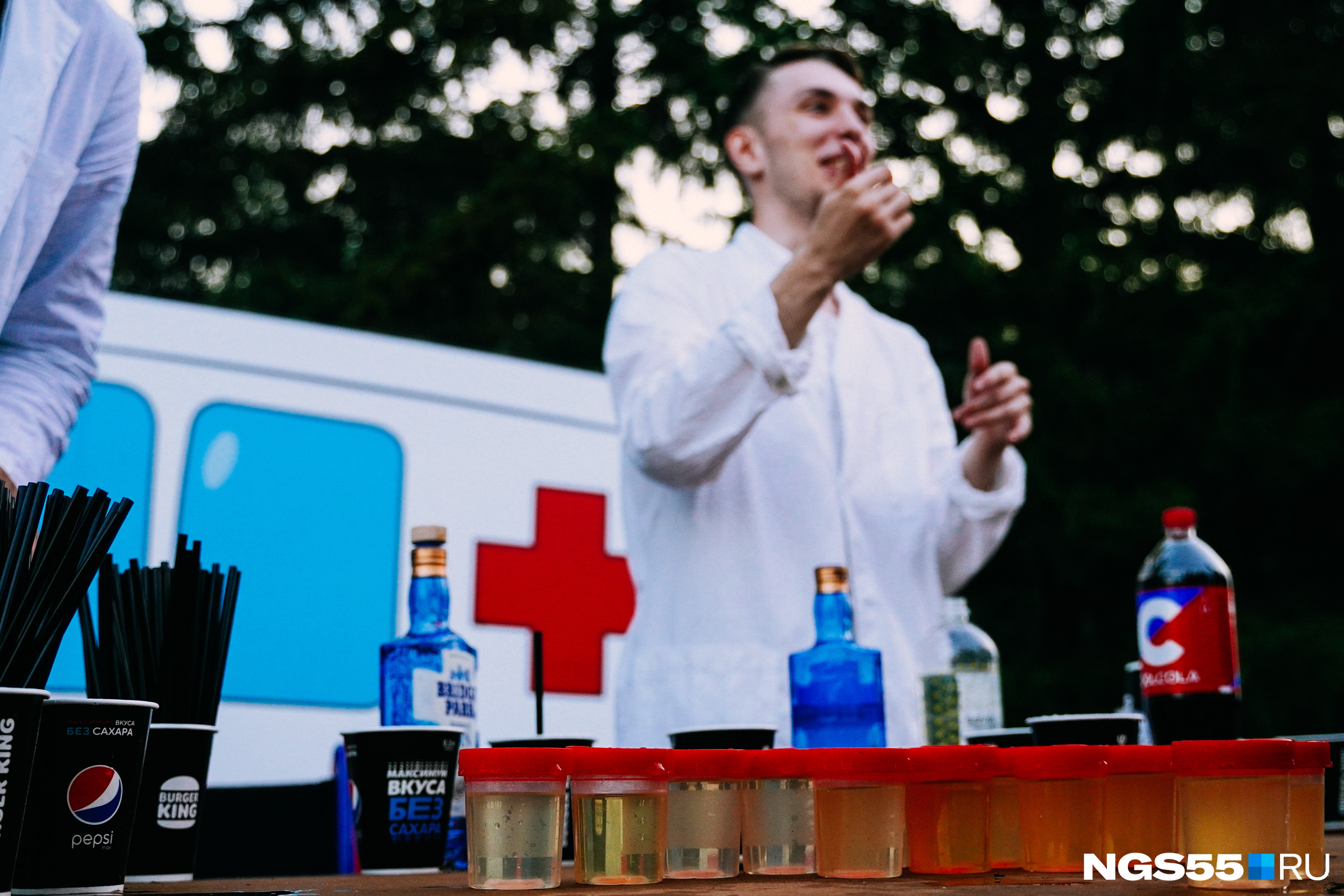 Отдельное внимание отдыхающих привлек пункт скорой помощи, где медики в белоснежных халатах предлагали попробовать горячительные напитки, которые разливали в баночки для анализов. Вообще, эта локация называлась «Полянкой доктора Айболита»