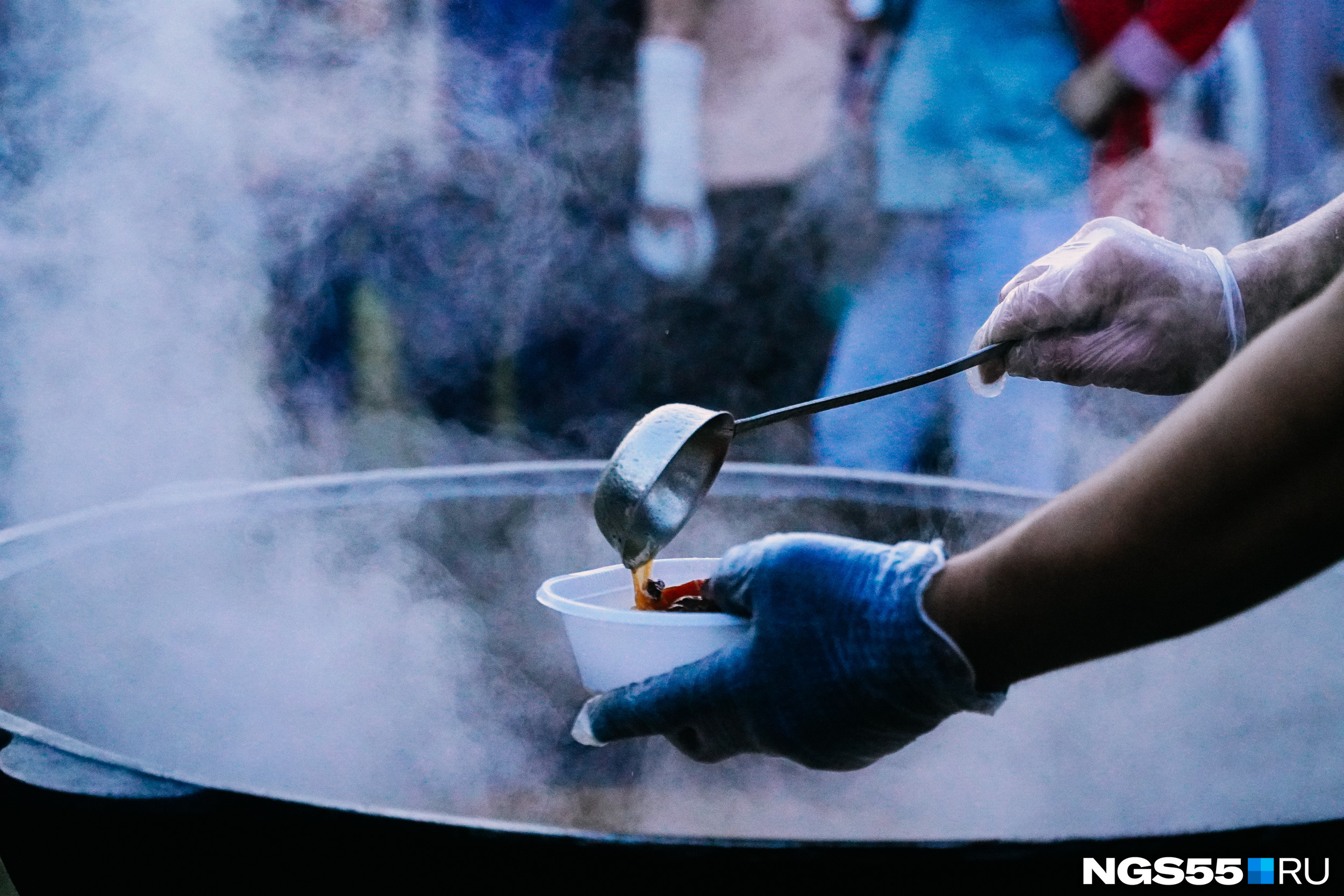 Гостям предлагали горячее, например лагман и манты. За угощением нужно было выстоять длинную очередь, но голодным никто не остался