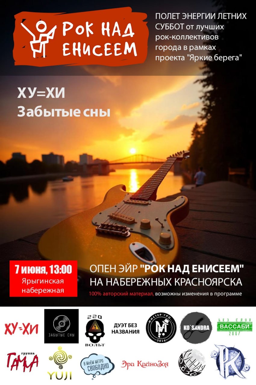 7 июня, в День города, на Ярыгинской набережной стартует фестиваль «Рок над Енисеем», где красноярские коллективы каждые выходные будут показывать красноярцам своё авторское творчество. В субботу на сцену выйдут группы: «ХУ=ХИ» и «Забытые сны». Начало концерта в 13:00.