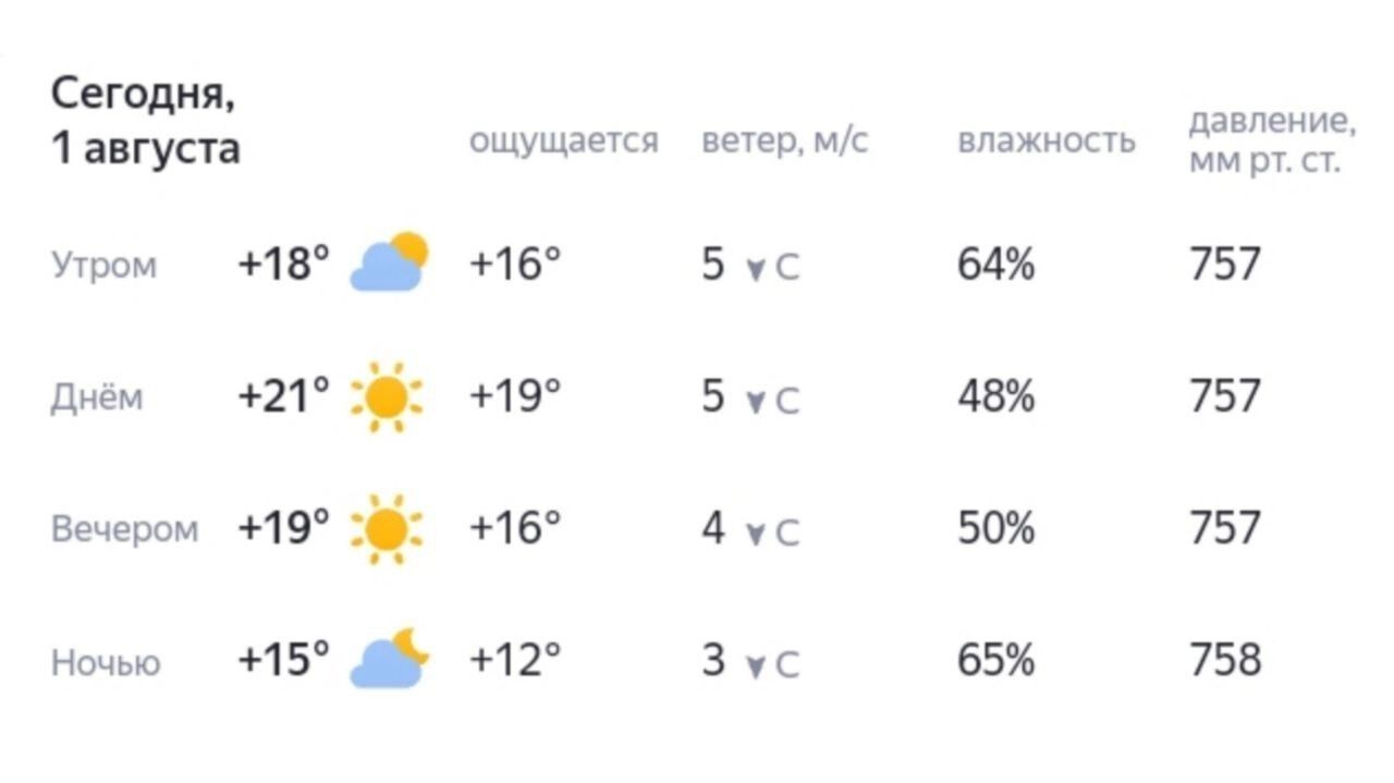 В пятницу, 1 августа, средняя температура по Югре составит до +18…+23 градусов днем, и до +10…+15 градусов — ночью. В центральной и восточной частях возможно дневное потепление до +28 градусов, в северной — похолодание до +5 градусов. Также прогнозируют небольшой дождь. Ветер — северный, 5-10 м/с. Возможны порывы ветра до 14 м/с.