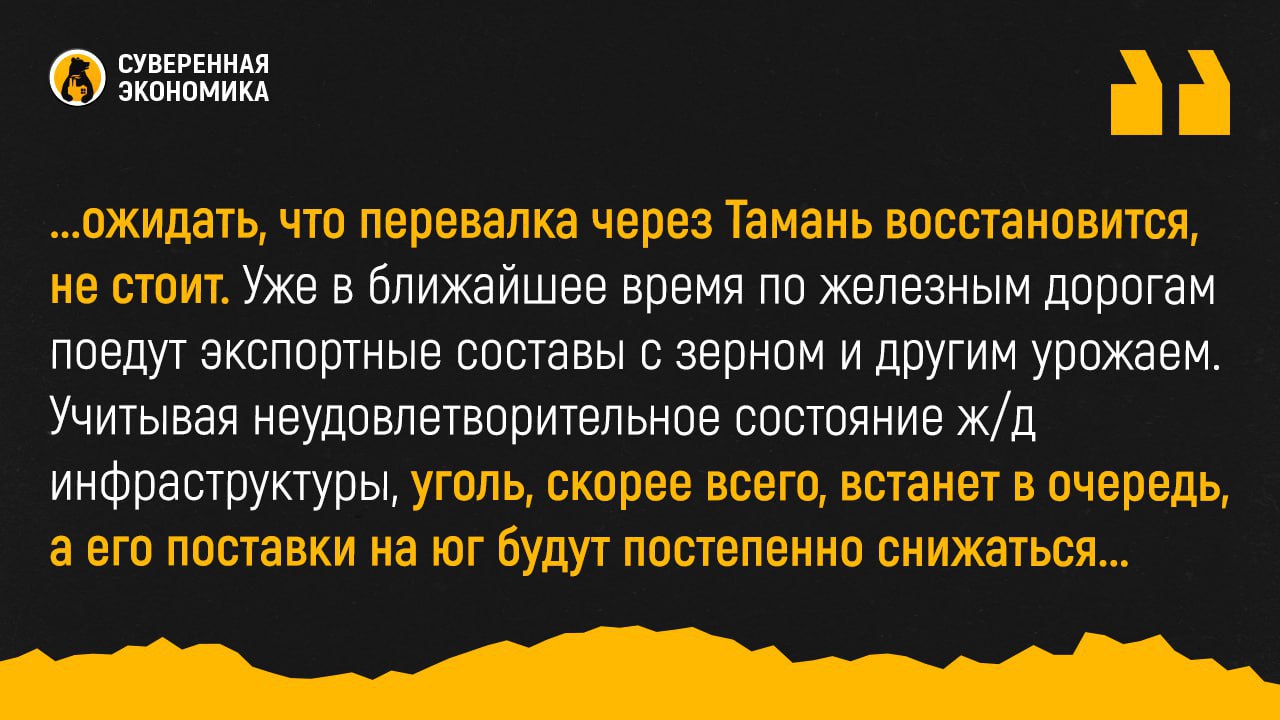 В целом же ожидать, что перевалка через Тамань восстановится, не стоит. Уже в ближайшее время по железным дорогам поедут экспортные составы с зерном и другим урожаем. Учитывая неудовлетворительное состояние ж/д инфраструктуры, уголь, скорее всего, встанет в очередь, а его поставки на юг будут постепенно снижаться. Дело в том, что экспорт данного груза либо имеет совсем небольшую рентабельность, либо уходит в минус. Именно такая ситуация сложилась на северо-западе и юге России.