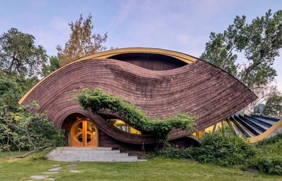 Примечательно: Двухэтажная резиденция, площадь которой составляет 170 кв. метров, отличается особыми геометрическими формами. В экстерьере дома практически отсутствуют прямые линии, при этом самым заметным элементом является массивная волнообразная крыша, нависающая над основным строением, большей частью террасы и лестницей, ведущей ко второму входу. Часть структуры, обеспечивающая отдых на свежем воздухе, предназначалась для организации посиделок как самой семьи, так и гостей, желающих провести время в окружении завораживающей природы. Главной сложностью при строительстве стало близкое расположение участка к затопляемой части поймы ручья во время половодья, что заставило поднимать жилую часть над землей.