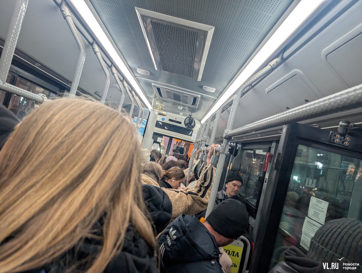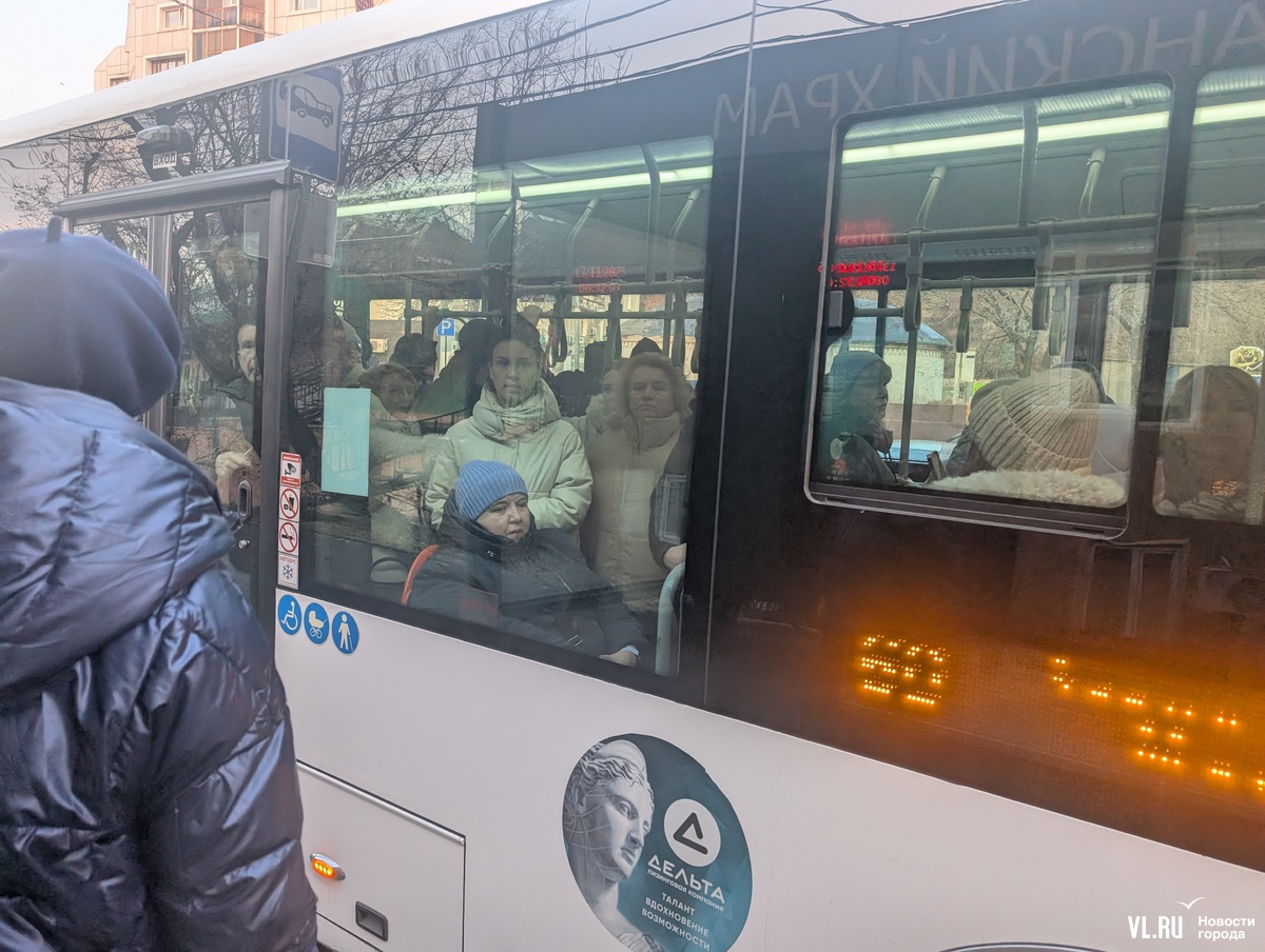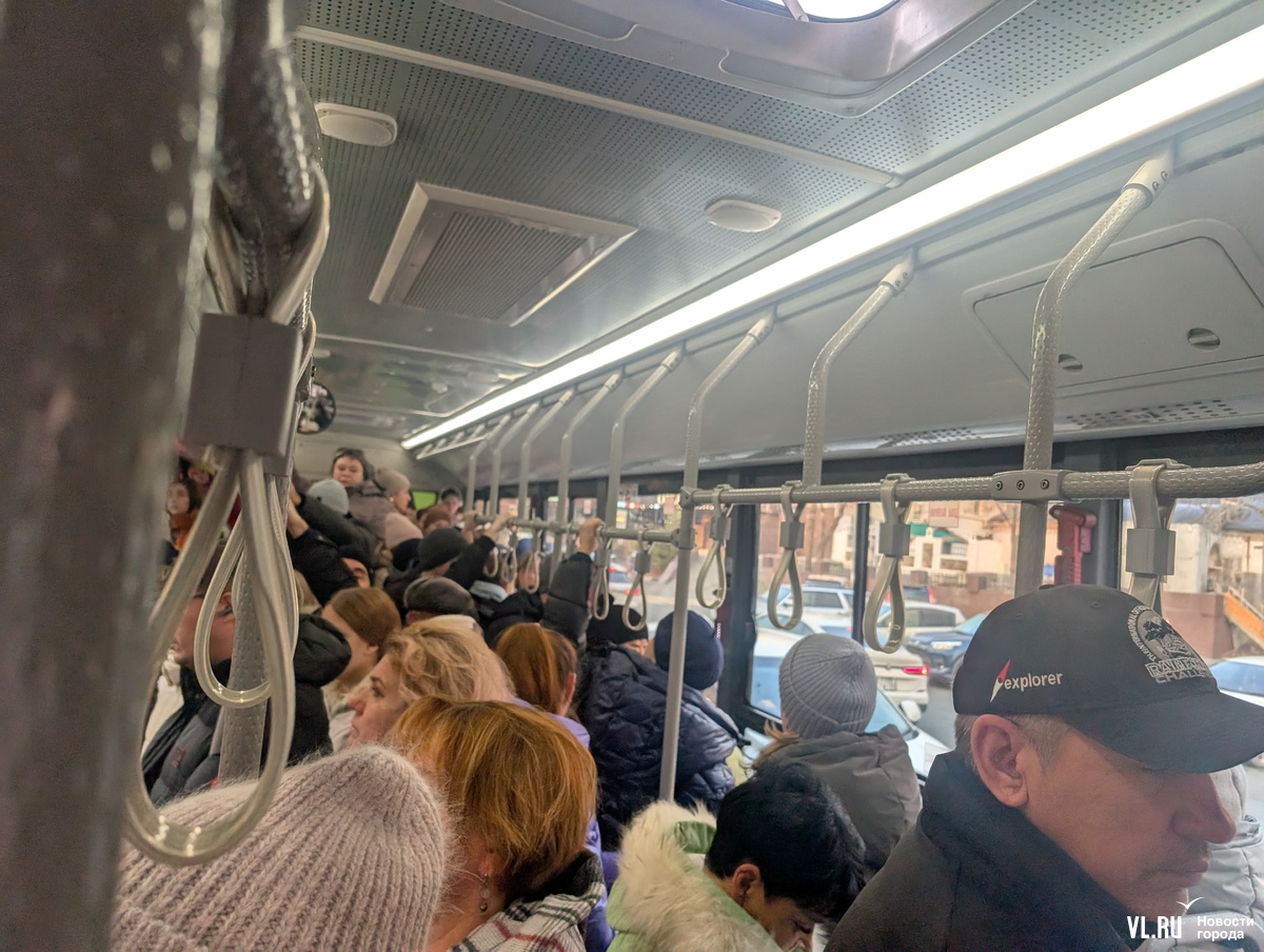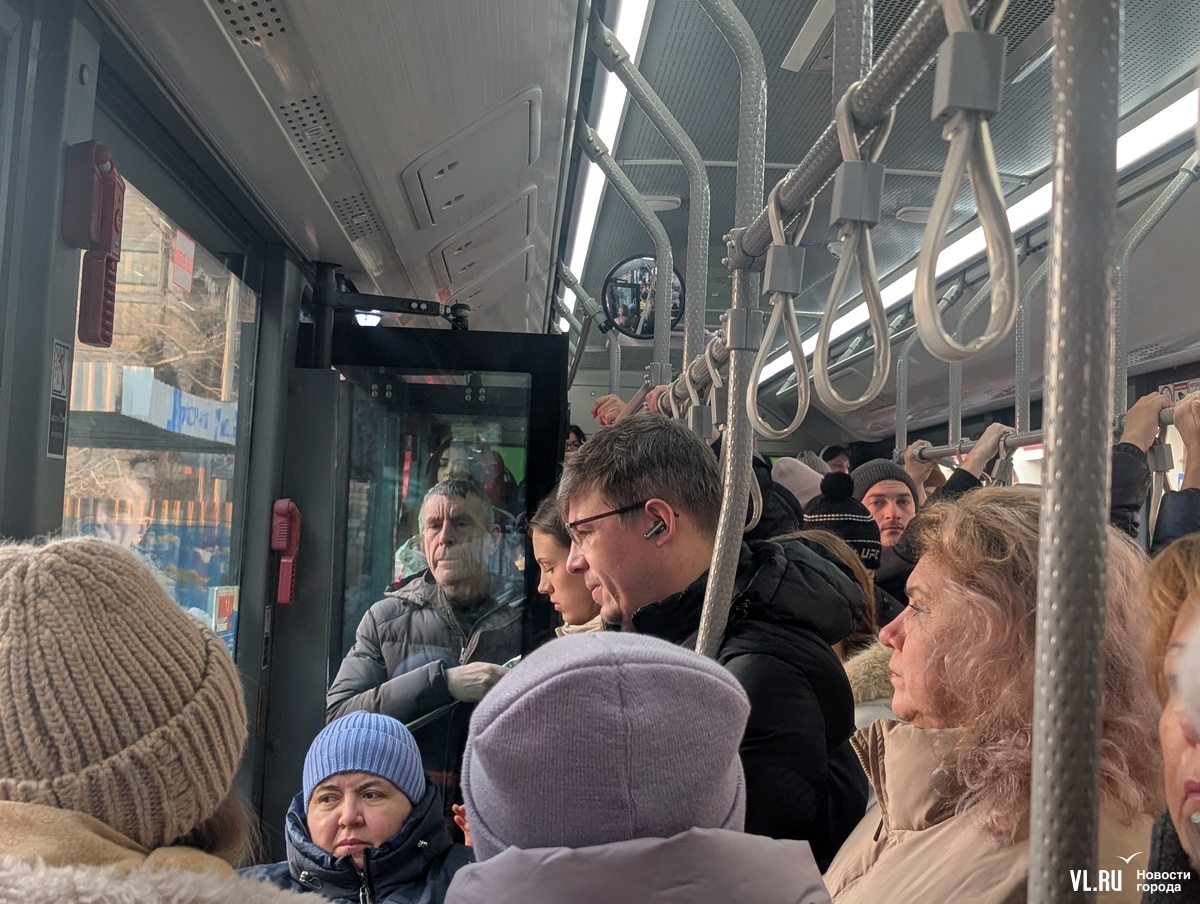 Корреспондент Новостей VL.ru, не ожидая, что места у дверей займут так быстро, оказывается в конце очереди вместе с другими несчастными. На раздумья есть пара секунд – либо ты запрыгиваешь, готовый к тому, что тебя придавит дверью, либо остаёшься стоять на улице. Эту дилемму решает другой пассажир, отодвигающий конкурента рукой, протискивающийся внутрь и занимающий последние сантиметры свободного пространства. Неудача – переполненный автобус уезжает на Эгершельд.