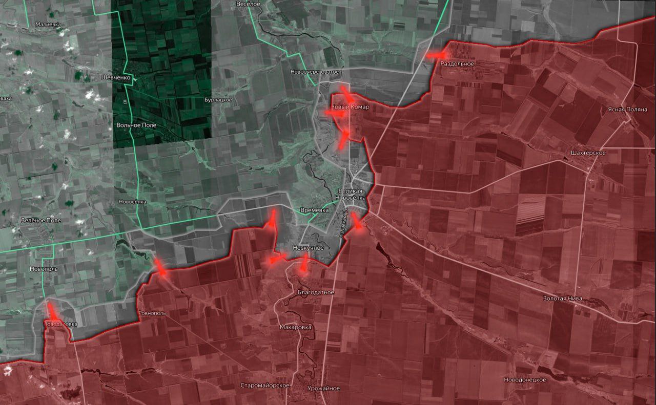 На Времьевском направлении ВС РФ расширяют присутствие в районе н.п. Новый Комар. Ранее российские войска держали под контролем только жилую застройку села, но теперь фиксируется укрепление и расширение зоны контроля на юг, запад и север.