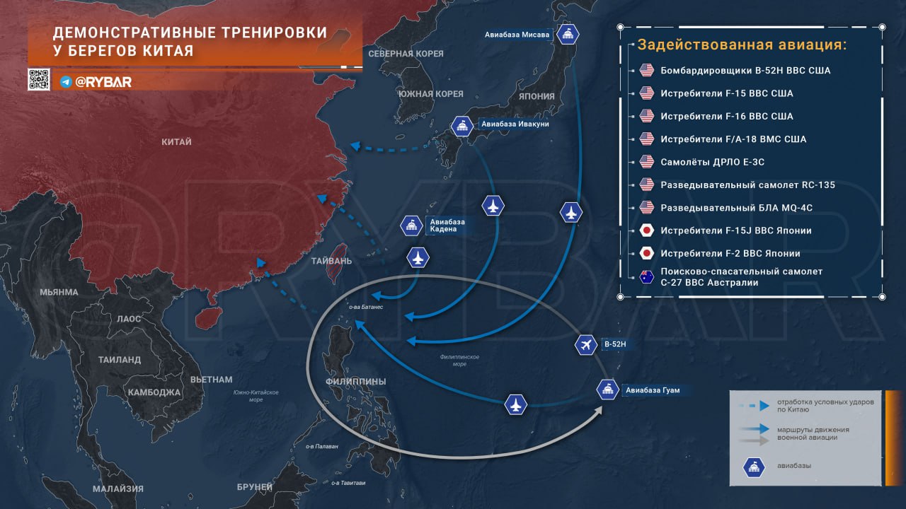 Сразу после они провели демонстративный полет у берегов Тайваня, а также пролетели над оспариваемыми островами в Южно-Китайском море, и вернулись обратно. Вчера они сделали то же самое.