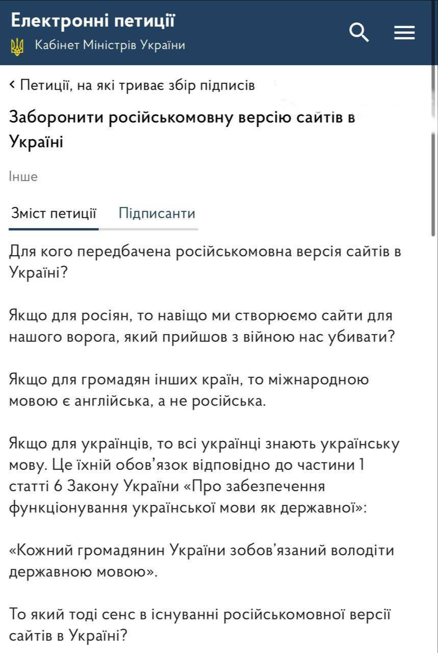 Петиция о запрете русскоязычных версий сайтов набрала 25 000 подписей хуторских идиотов и теперь правительство обязано рассмотреть ее в течение трех дней.