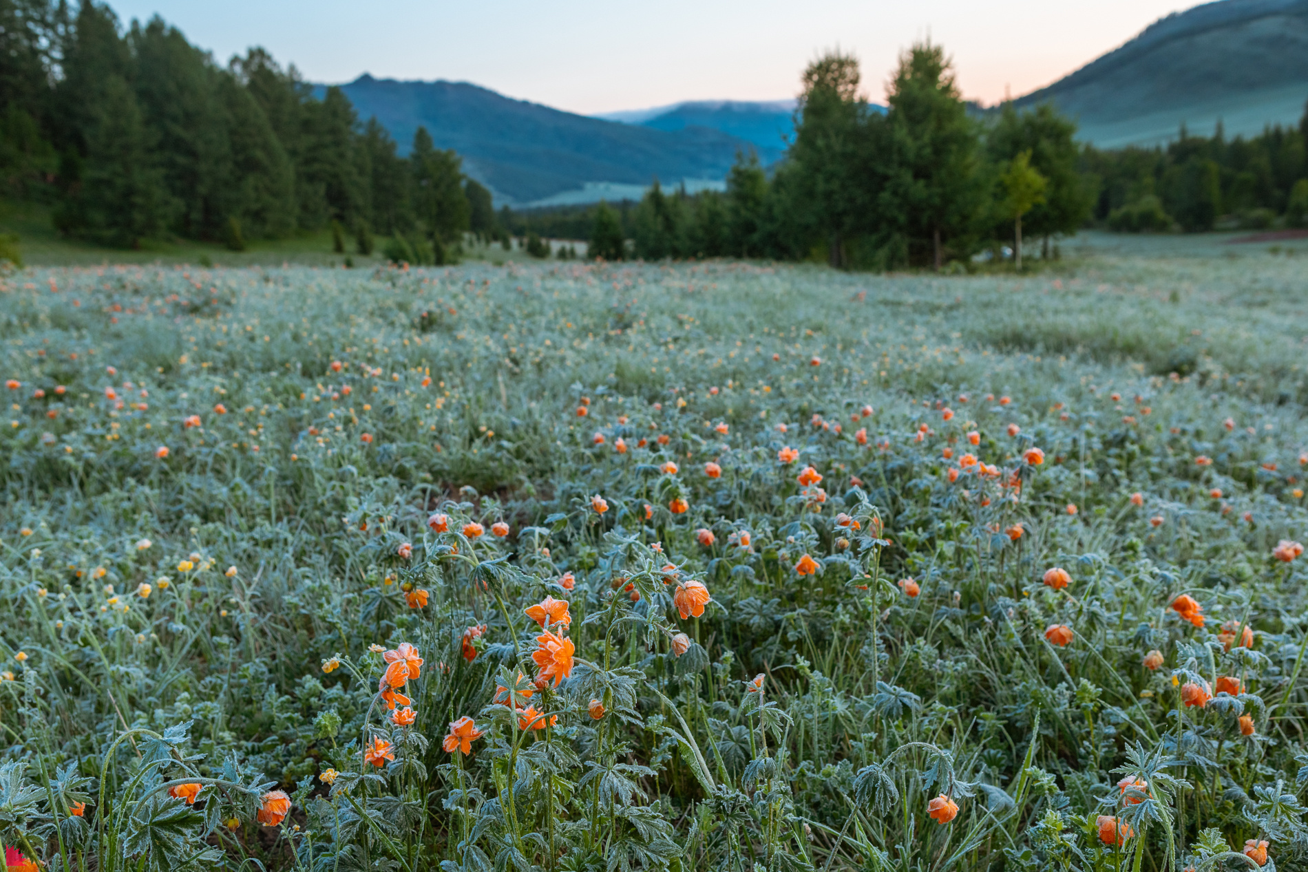 Фотохудожник поехал на Алтай в середине июня, чтобы застать настоящую красоту — цветение огоньков (так называются местные цветы ярко-оранжевого цвета). В этих же горах располагается целая система озер и рек.