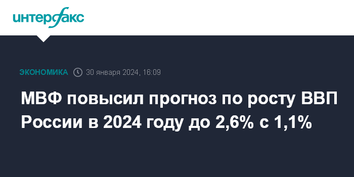 Москва. 30 января. INTERFAX.RU - Международный валютный фонд повысил оценку динамики российской экономики в 2024 году до 2,6% с 1,1%, ожидавшихся им в октябре. Обновленный прогноз приводится в январском обзоре мировой экономики (WEO Update: Moderating Inflation and Steady Growth Open Path to Soft Landing).