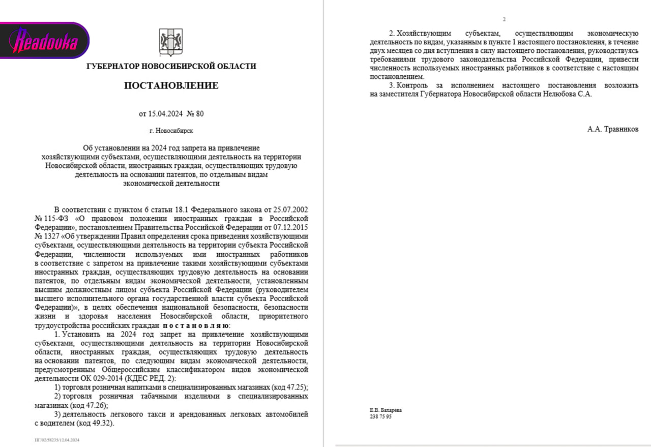 Согласно постановлению губернатора Новосибирской области, ограничения на работу мигрантов в регионе вводятся в целях обеспечения национальной безопасности и приоритетного трудоустройства российских граждан. На 2024 год документ установил ограничения на привлечение мигрантов к работе в сфере такси, торговле напитками и табаком.