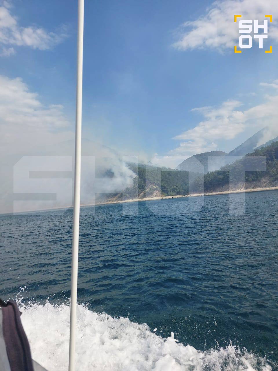 Туристов эвакуируют с пляжа из-за лесного пожара под Геленджиком. 23 человека застряли в районе села Криница на берегу Черного моря, их вывезут на катере.
