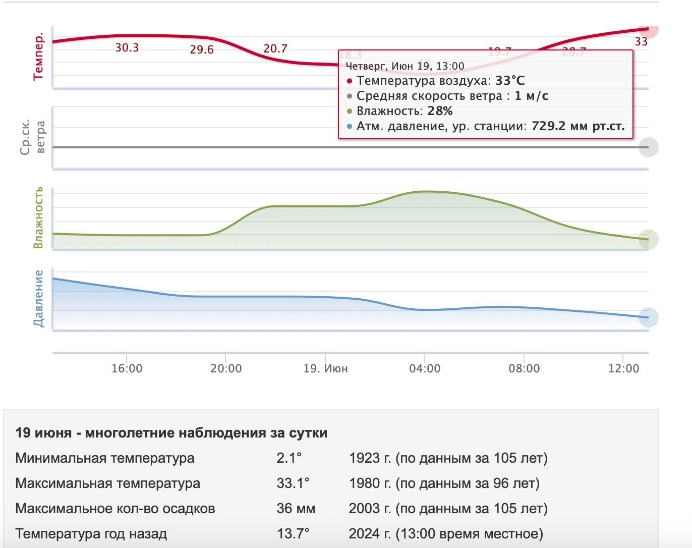 Гидрометцентр пока зафиксировал в Красноярске максимум +33 градуса. Кстати, самым жарким за 96 лет наблюдений стало 19 июня в 1980 году — тогда было +33,1 градуса.