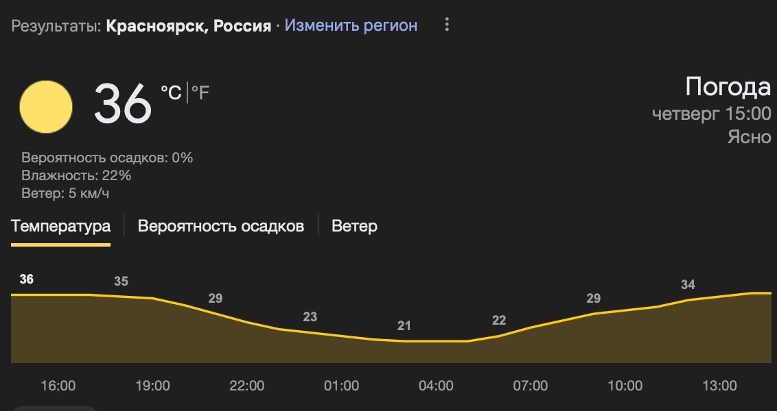 При этом метеосервисы показывают температуру в +35…+36 в Красноярске.
