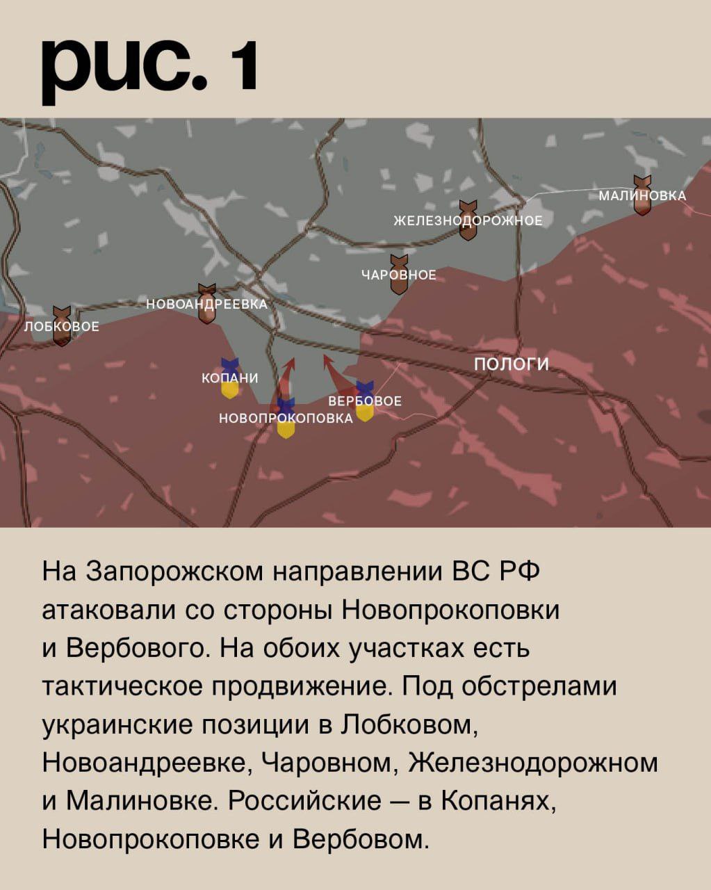На Запорожском направлении ВС РФ атаковали со стороны Новопрокоповки и Вербового. На обоих участках есть тактическое продвижение. Под обстрелами украинские позиции в Лобковом, Новоандреевке, Чаровном, Железнодорожном и Малиновке. Российские – в Копанях, Новопрокоповке и Вербовом. (Рис. 1)
