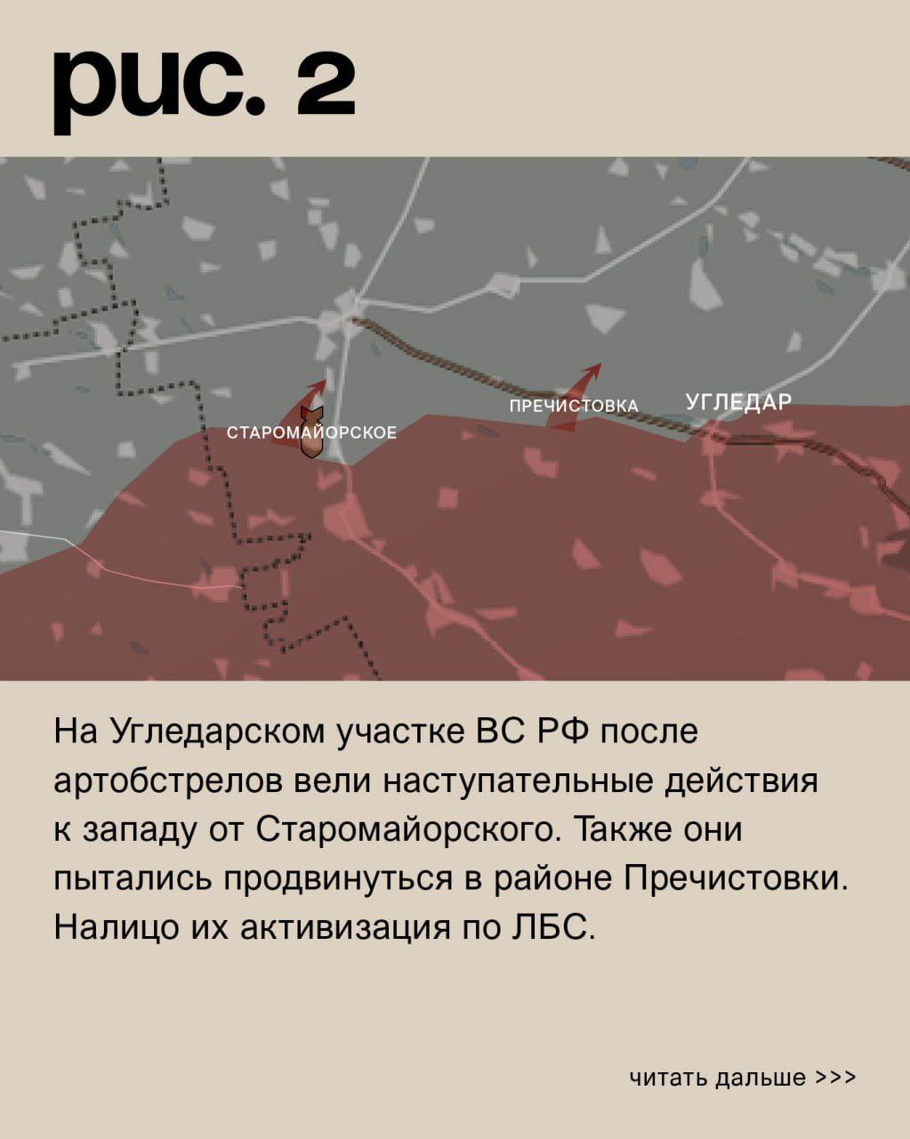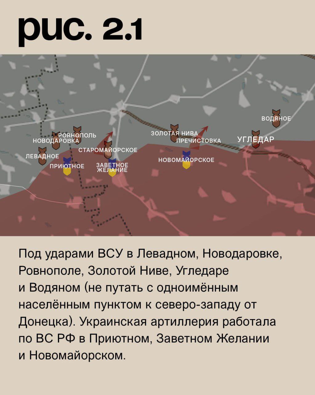 На Угледарском участке ВС РФ после артобстрелов вели наступательные действия к западу от Старомайорского. Также они пытались продвинуться в районе Пречистовки. Налицо их активизация по ЛБС. Под ударами ВСУ в Левадном, Новодаровке, Ровнополе, Золотой Ниве, Угледаре и Водяном (не путать с одноимённым населённым пунктом к северо-западу от Донецка). Украинская артиллерия работала по ВС РФ в Приютном, Заветном Желании и Новомайорском. (Рис. 2)