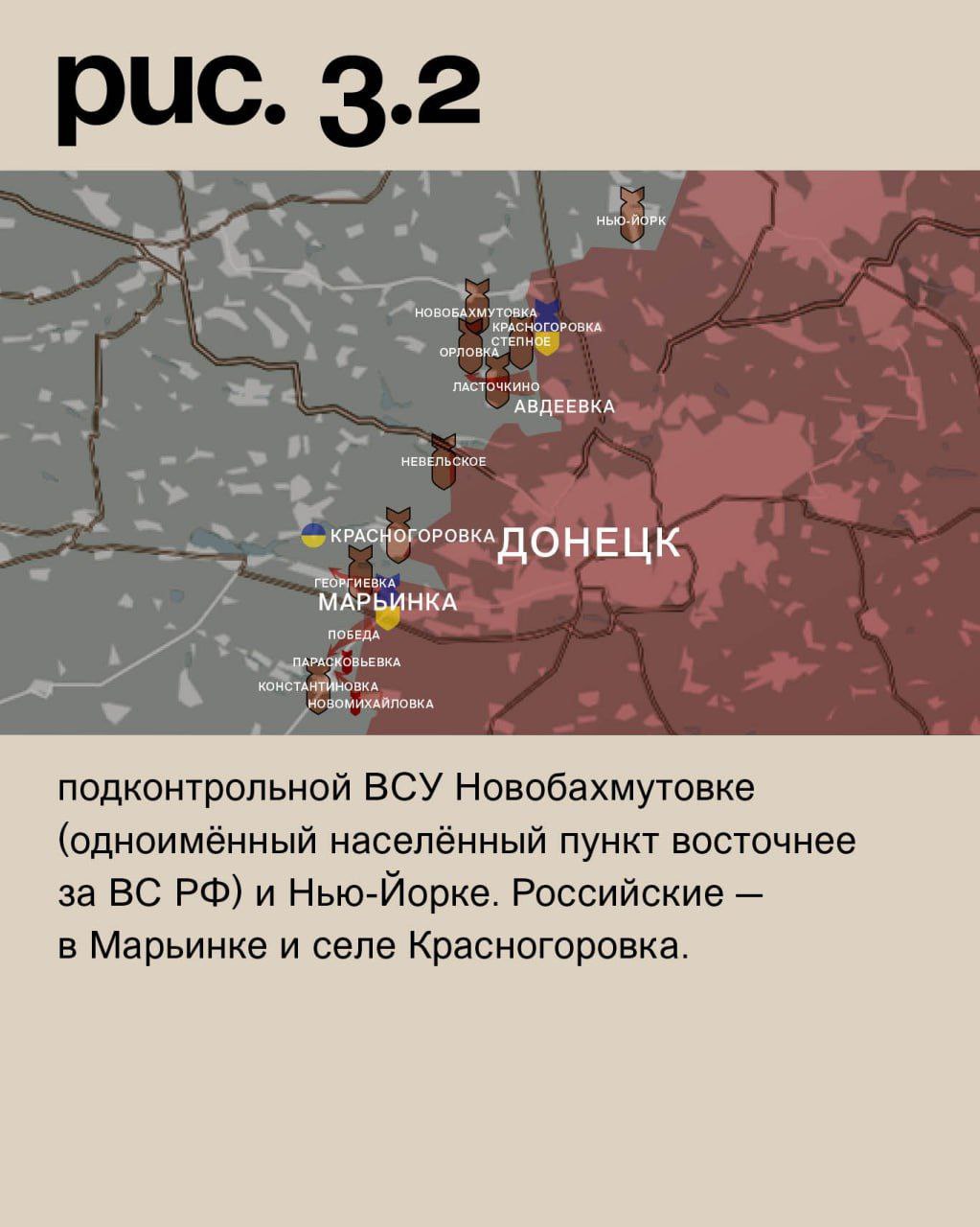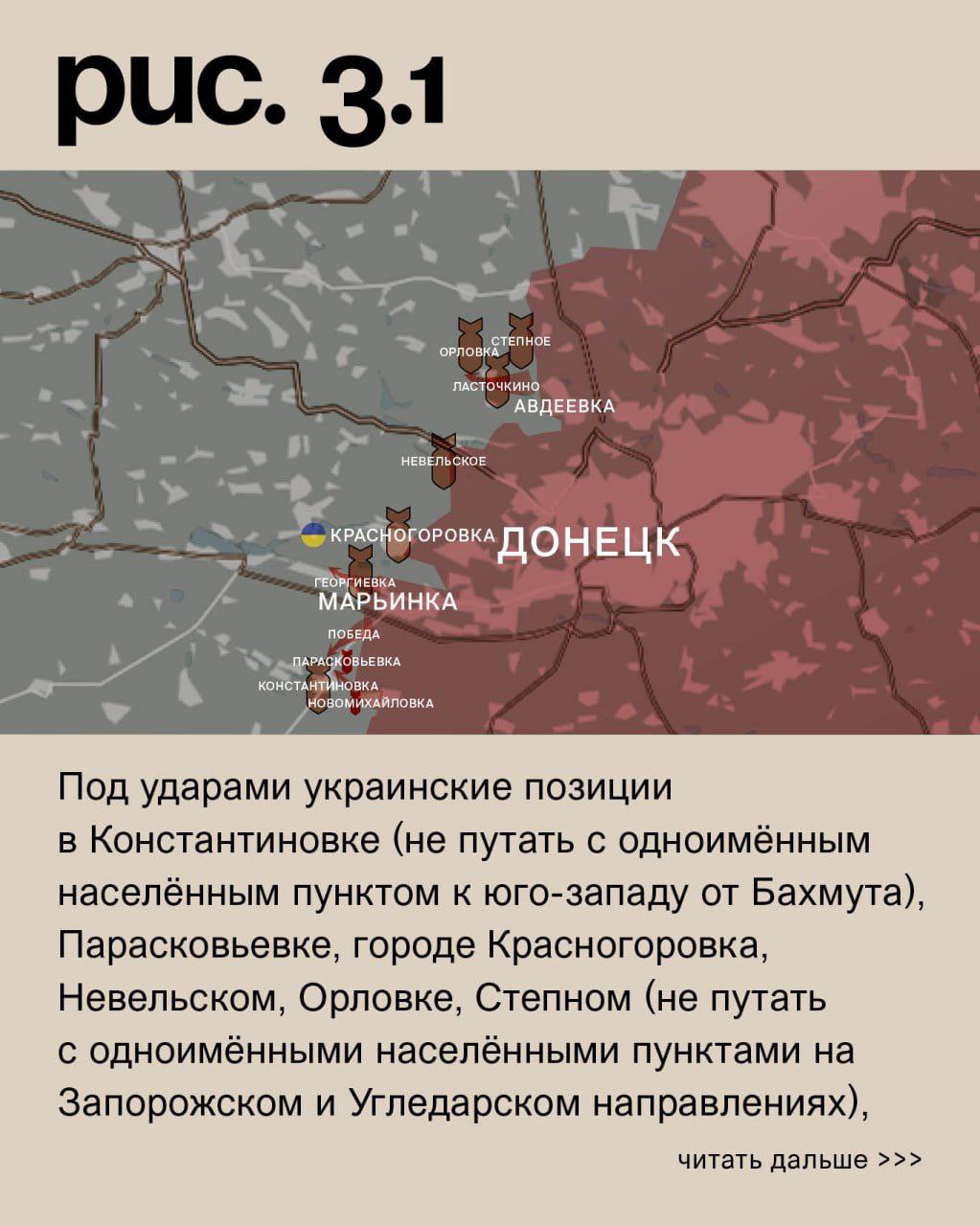На Донецком фронте российские войска при поддержке средств дальнего поражения вели штурмовые действия в Новомихайловке. Также они пытались прорвать украинскую оборону у Победы. После артобстрелов атаковали в районе Георгиевки и Ласточкина. Под ударами украинские позиции в Константиновке (не путать с одноимённым населённым пунктом к юго-западу от Бахмута), Парасковьевке, городе Красногоровка, Невельском, Орловке, Степном (не путать с одноимёнными населёнными пунктами на Запорожском и Угледарском направлениях), подконтрольной ВСУ Новобахмутовке (одноимённый населённый пункт восточнее за ВС РФ) и Нью-Йорке. Российские – в Марьинке и селе Красногоровка. (Рис. 3)