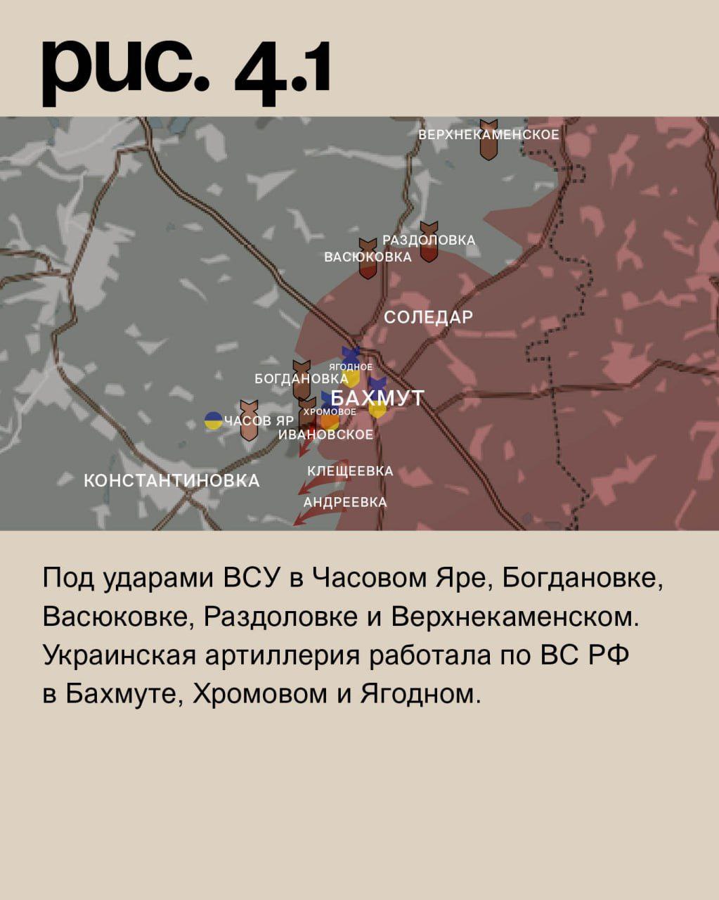 На Бахмутском направлении ВС РФ вели штурмовые действия у Андреевки и Клещеевки, куда перебросили резервы. После артобстрелов они сумели продвинуться к Ивановскому со стороны Хромового и фактически вышли на окраины села. Под ударами ВСУ в Часовом Яре, Богдановке, Васюковке, Раздоловке и Верхнекаменском. Украинская артиллерия работала по ВС РФ в Бахмуте, Хромовом и Ягодном. (Рис. 4)