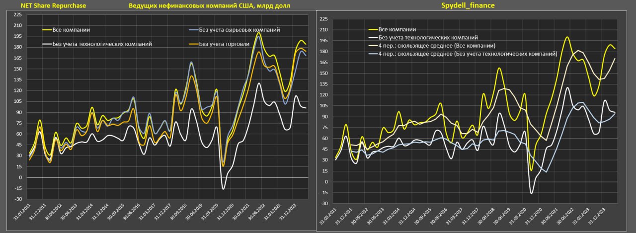 Если объединить все нефинансовые компании (до 800 млрд в 2024) с учетом финансового сектора (130-140 млрд) получается до 930 млрд чистого байбека по верхней границе – не более 1.6% чистого возврата относительно капитализации рынка.