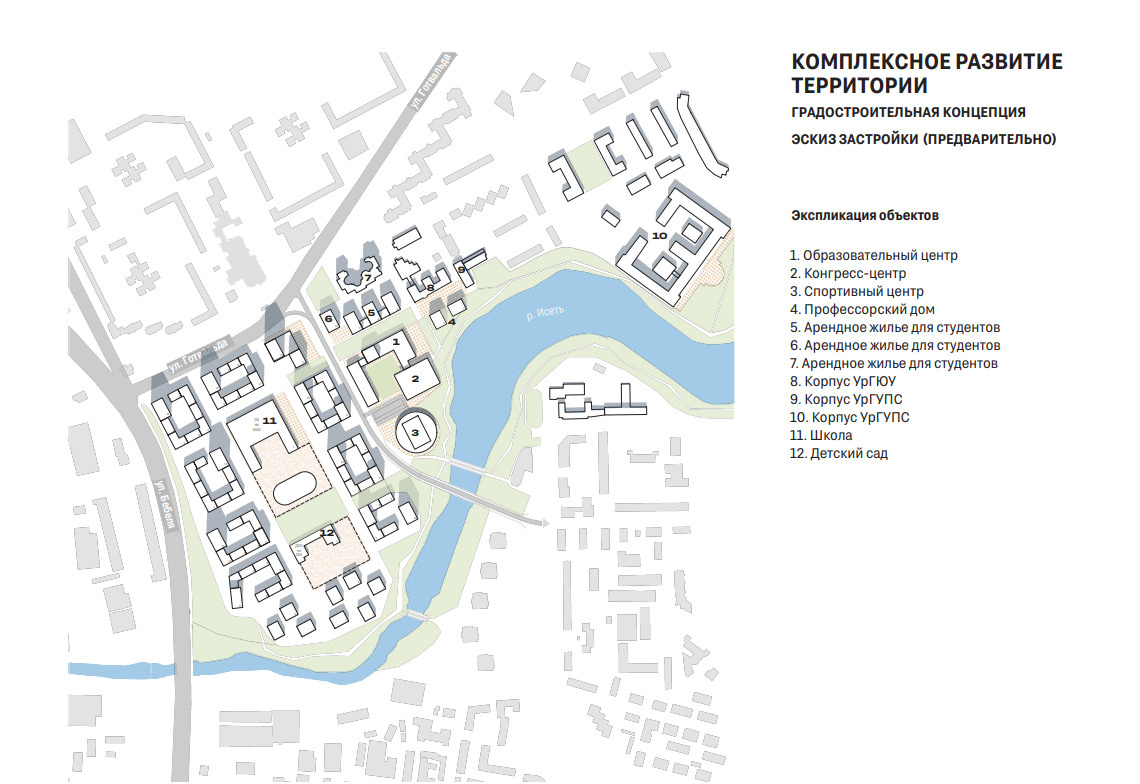 Изначальная задача в том, чтобы построить новый корпус для Уральского юридического университета. Его возведением займется компания «Брусника». В то же время кампус может быть поделен с Уральским университетом путей сообщения, чтобы было проще получить финансирование из федерального бюджета.