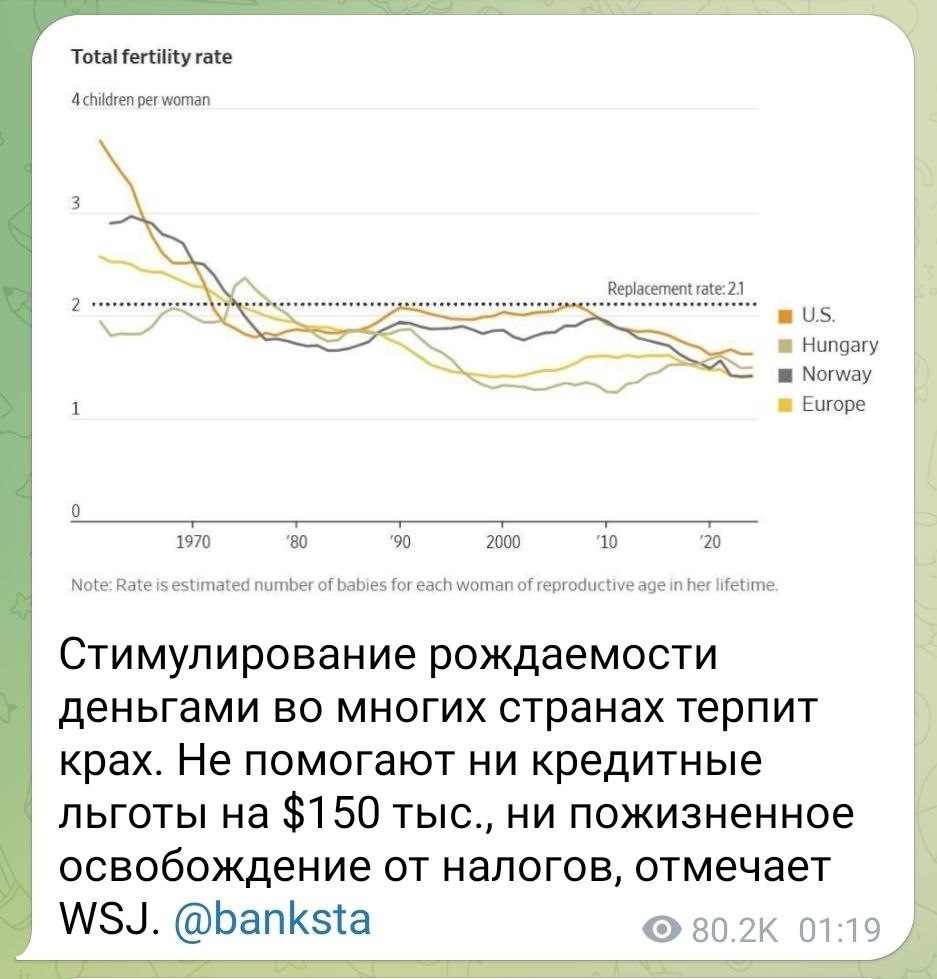 На диаграмме видно, что ключевой демографический показатель - СКР (суммарный коэффициент рождаемости) в самых развитых странах Запада, несмотря на огромные стимулирующие пособия, падает. Только одна не самая богатая европейская страна Венгрия показывает, более-менее, неплохой результат. А знаете почему? Потому что в Венгрии принят конституционный закон о защите жизни ребёнка не с момента рождения, как у нас и во многих других странах, а с момента зачатия, когда ребёнок уже становится душой, а убивающие его - душегубами. Вот он - ментальный разрыв между цивилизацией сатаны и цивилизацией Бога. Сегодня либеральная РФ - цивилизация сатаны, убивающая своих невинных детей и приносящая их в жертву дьяволу.