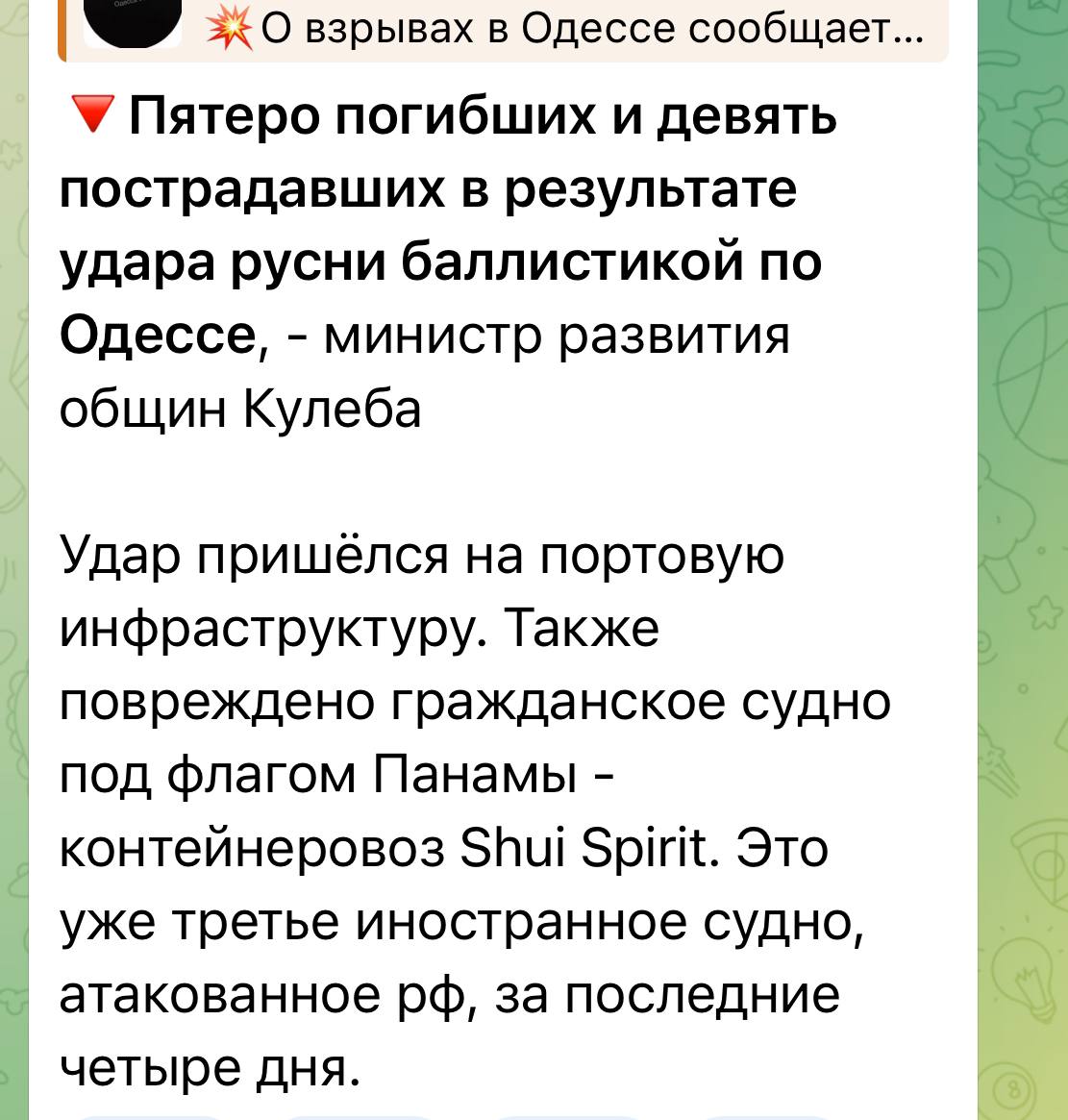 В результате удара баллистических ракет по 4-му причалу порта был поражен груз военного назначения, доставленный судном Shui Spirit под флагом Панамы. На месте удара наблюдается сильный пожар, сопровождающийся серией взрывов, что указывает на возможную вторичную детонацию боеприпасов или другого опасного груза.