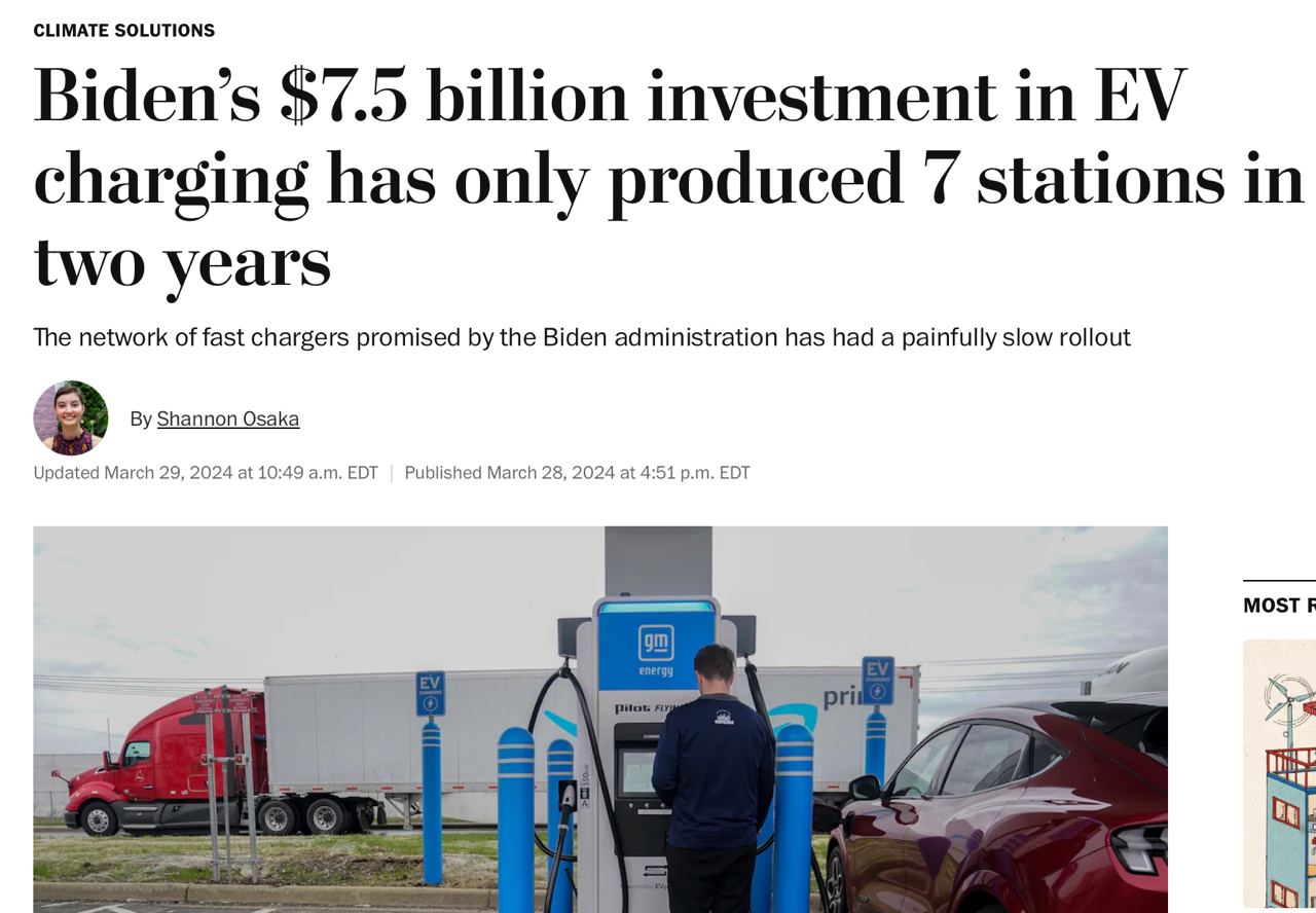 Будни зелёного перехода имени Байдена. В 2021 году Белый дом под фанфары принял свою инфраструктурную реформу, в рамках которой выделил сразу 7,5 миллиардов долларов на госпрограмму постройки полумиллиона зарядных станций для электромобилей. За 2 года появилось только 7.