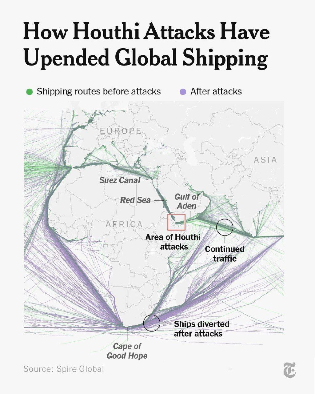 Thе New York Times опубликовал карту влияния атак йеменской "Ансаруллы" на движение кораблей в Красном море.
