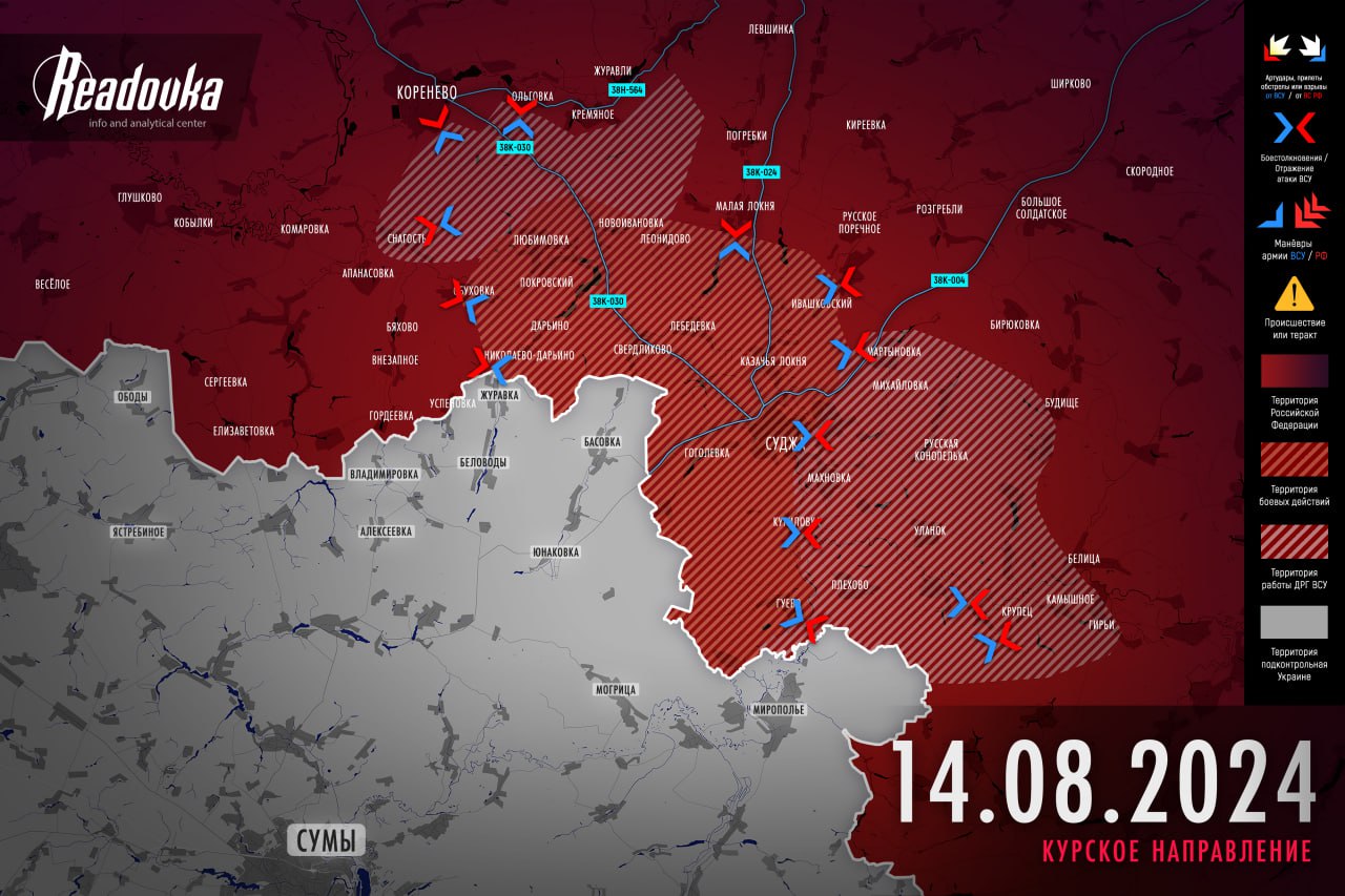 К утру 14 августа ситуация в приграничных регионах, подвергшихся разоряющему нападению ВСУ, существенно не изменилась. Зона боестолкновений по-прежнему простирается от Кореневского района до Беловского, из последнего вчера продолжалась добровольная эвакуация, как и в других непосредственно близких к очагу бедствия районам. В районе Коренево ВСУ отрядами ДРГ не оставляют попыток пройти к самому райцентру и ранее потерянной ими Снагости — попытки оперативно купируются, за последние сутки их было порядка пяти. В Беловском районе наши по-прежнему держат и Гирьи, и Озерки, за окраины которых все пытаются зацепиться одиночными группами вторженцы.