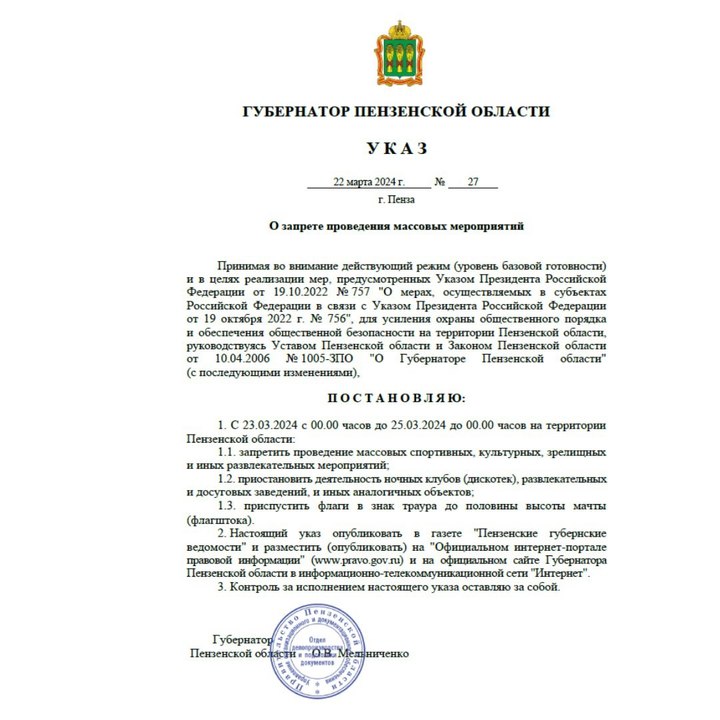 Губернатор Пензенской области Олег Мельниченко после трагичных событий в «Крокус Сити Холле», которые произошли вечером в пятницу, 22 марта, подписал указ об отмене массовых мероприятий в регионе.