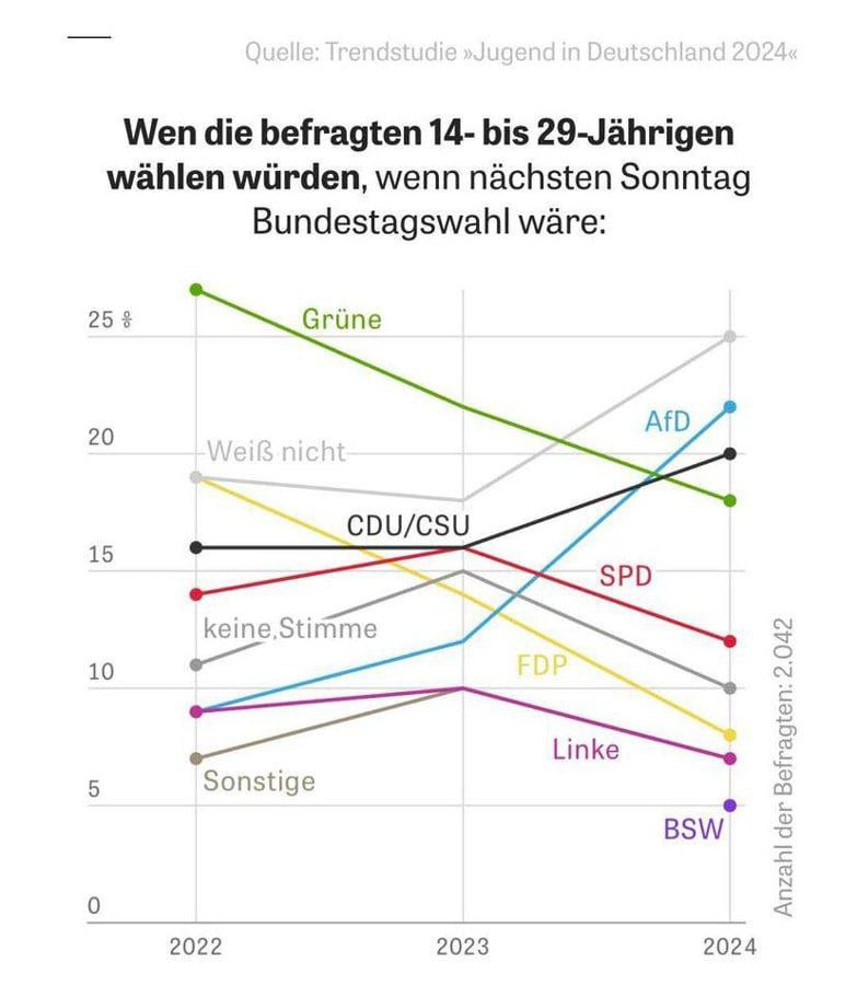 🇩🇪 Партия «Альтернатива для Германии» стала самой популярной партией среди немецкой молодежи в возрасте от 14 до 29 лет