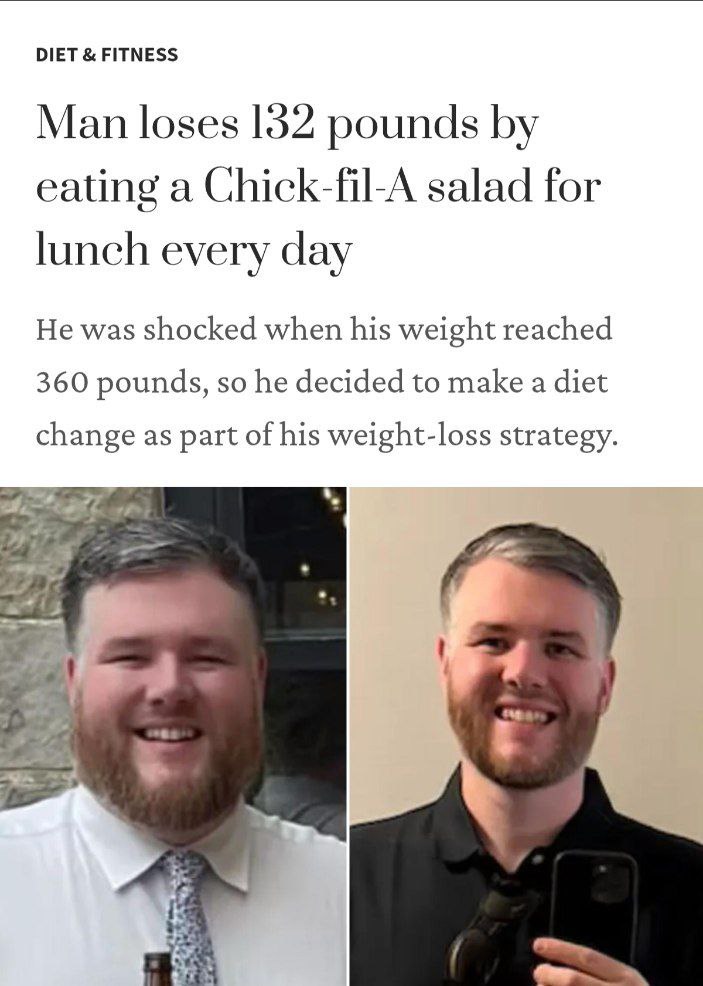 Мужик похудел на 60 кг, питаясь одним салатом: Том Кэрролл из США каждый день обедал салатом с курицей, а на ужин готовил его домашнюю версию.
